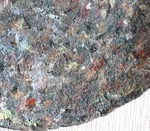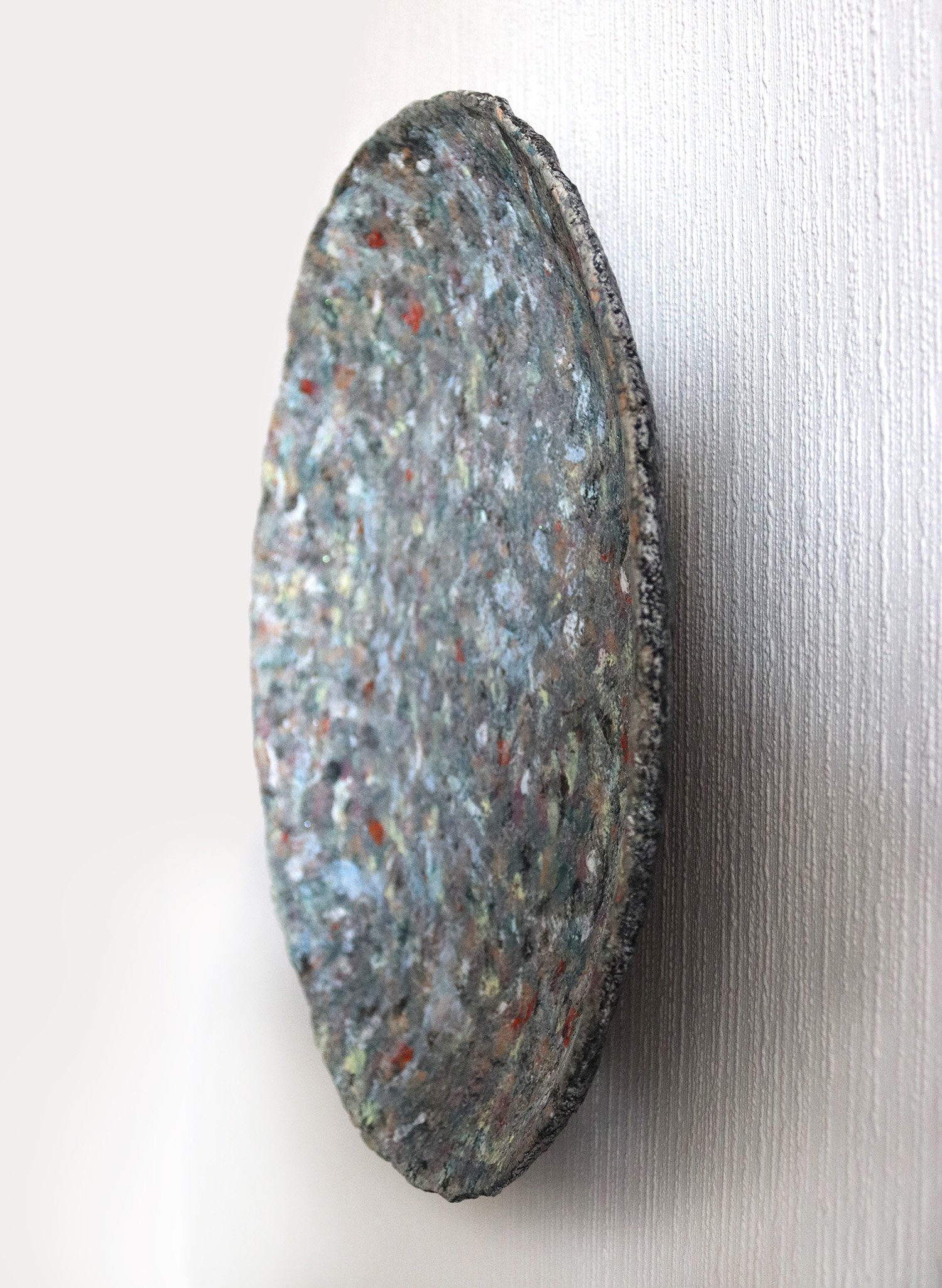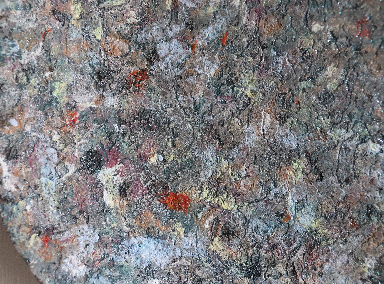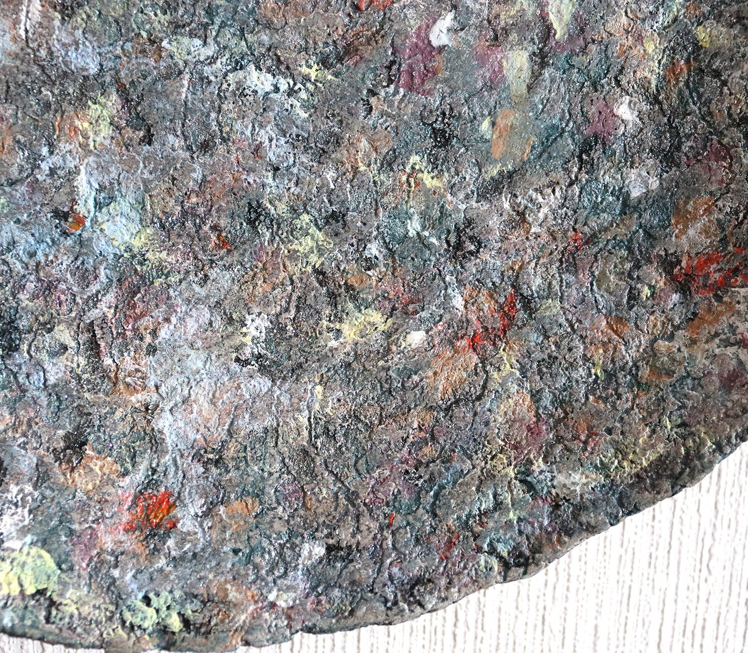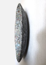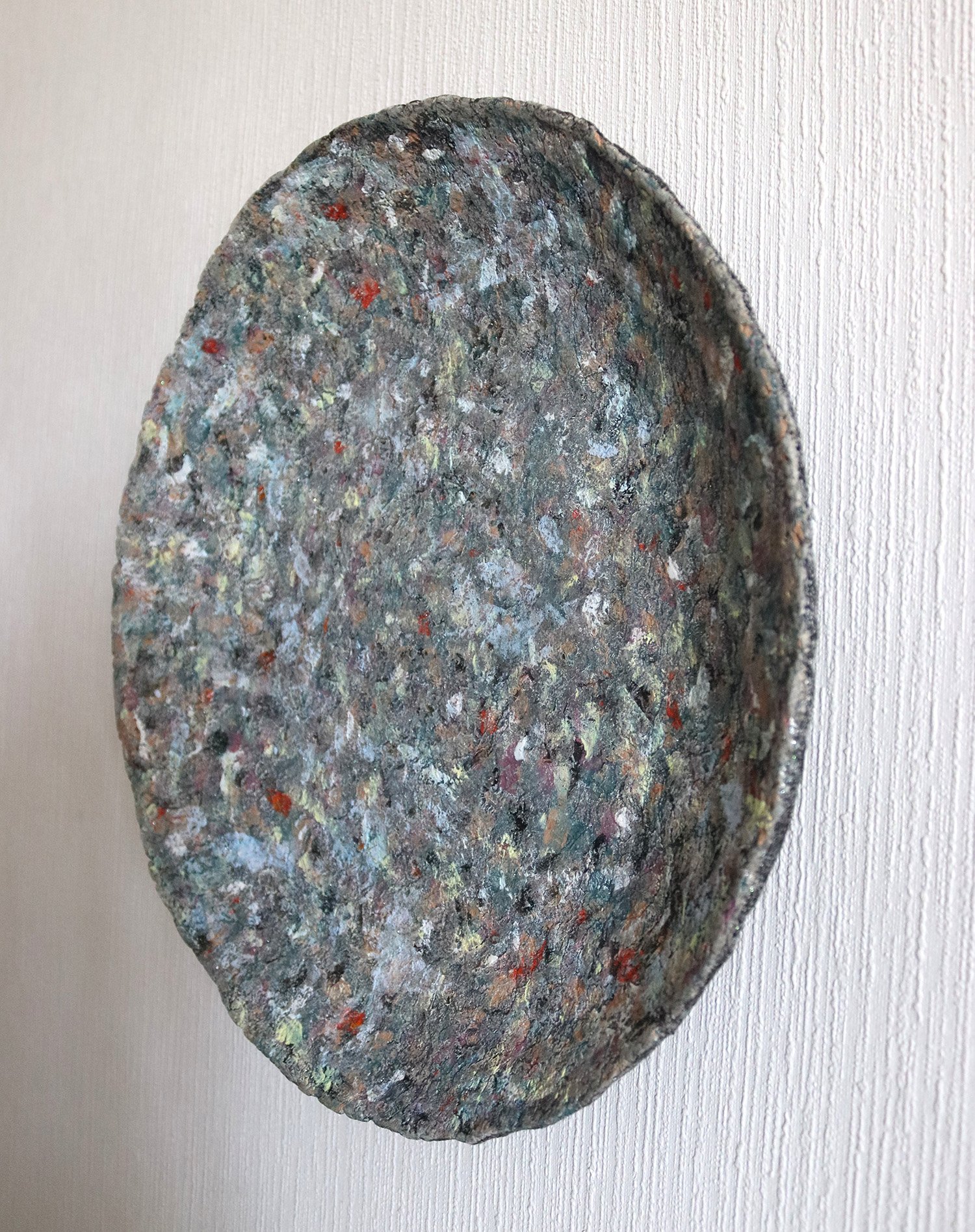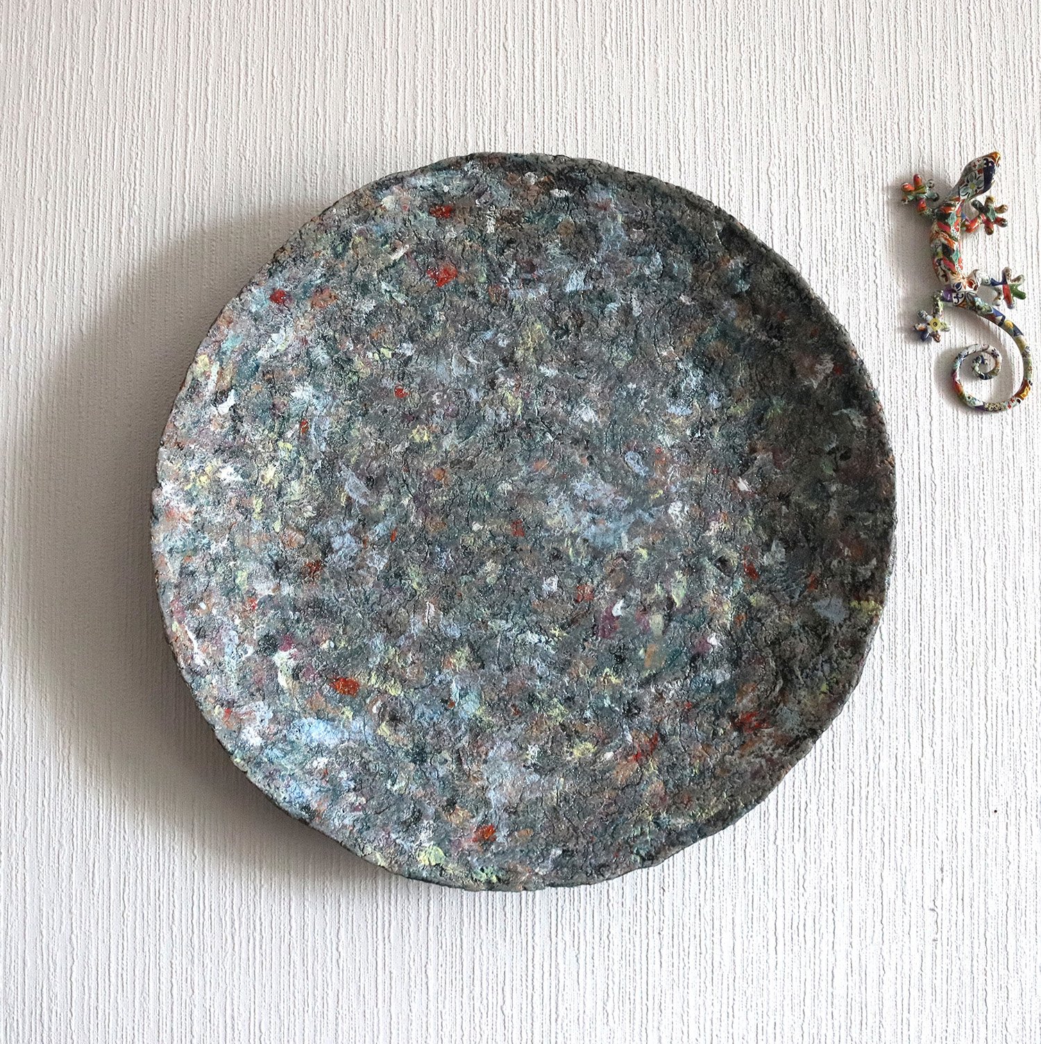 This handmade paper mache wall art features a richly layered surface reminiscent of stone, mineral textures, and weathered natural elements. Soft tones of grey, muted greens, and scattered warm accents create a balanced, organic composition that changes with light.