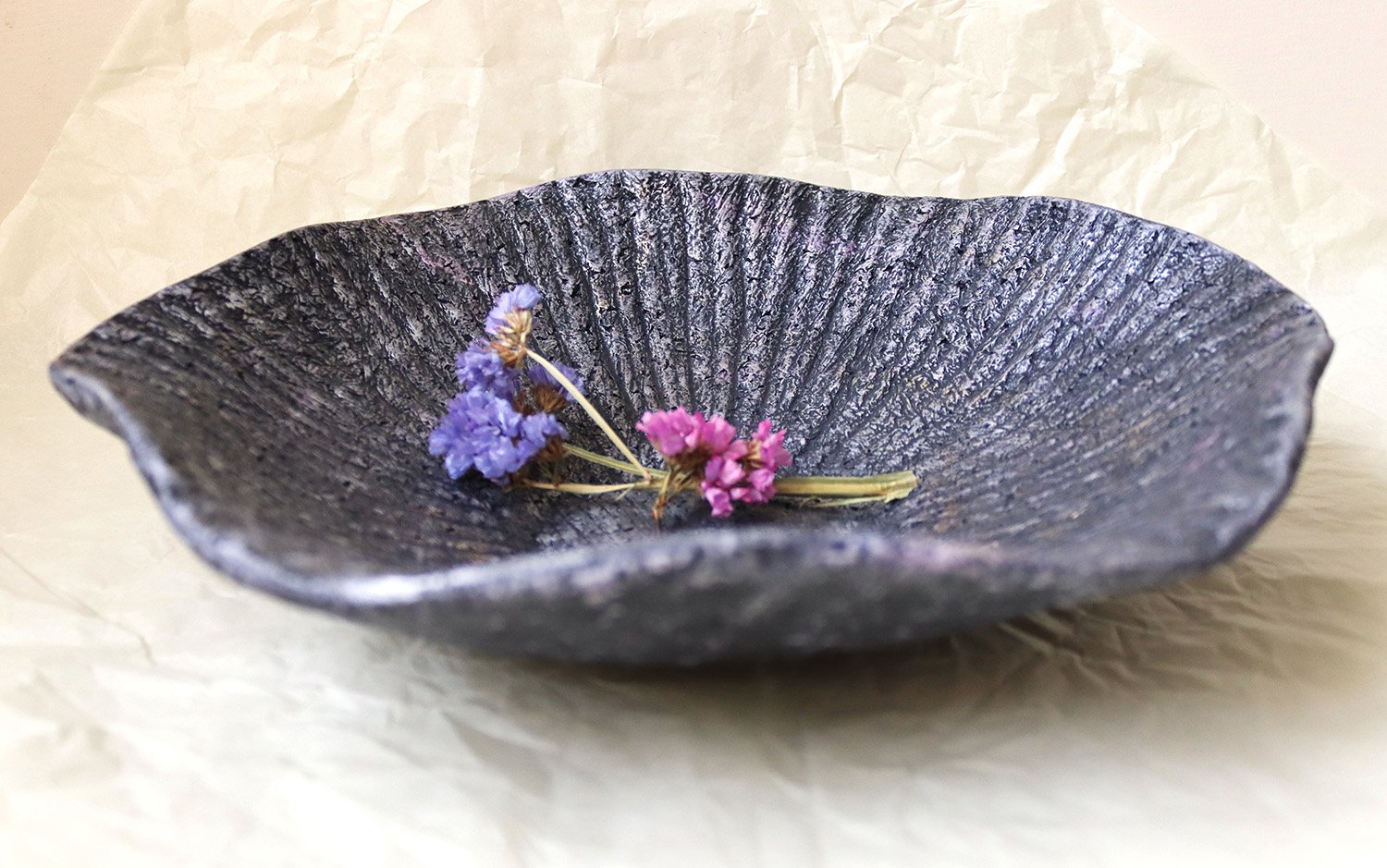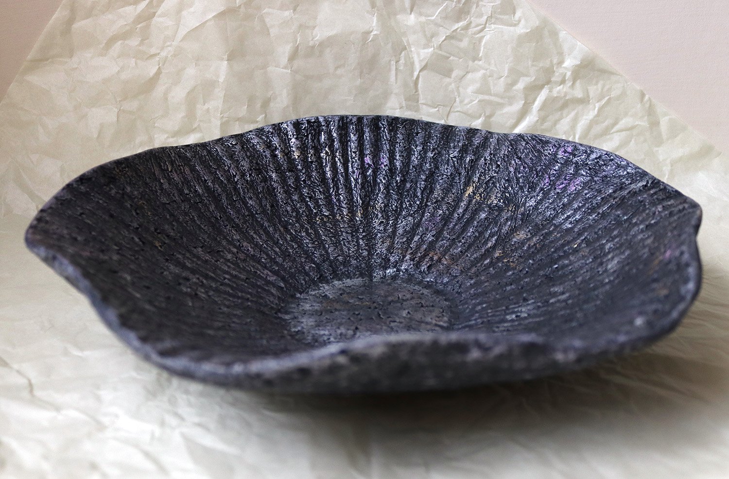 Discover this handcrafted dark silver wavy paper mâché bowl, made from lightweight recycled materials. Perfect as a decorative plate for your home, a perfect blend of art and sustainability.