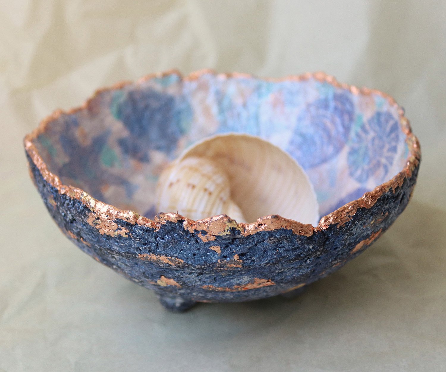 Handmade blue paper mache bowl with seashell and starfish decoupage, bronze rim, and four legs. Eco-friendly coastal decor inspired by the sea.