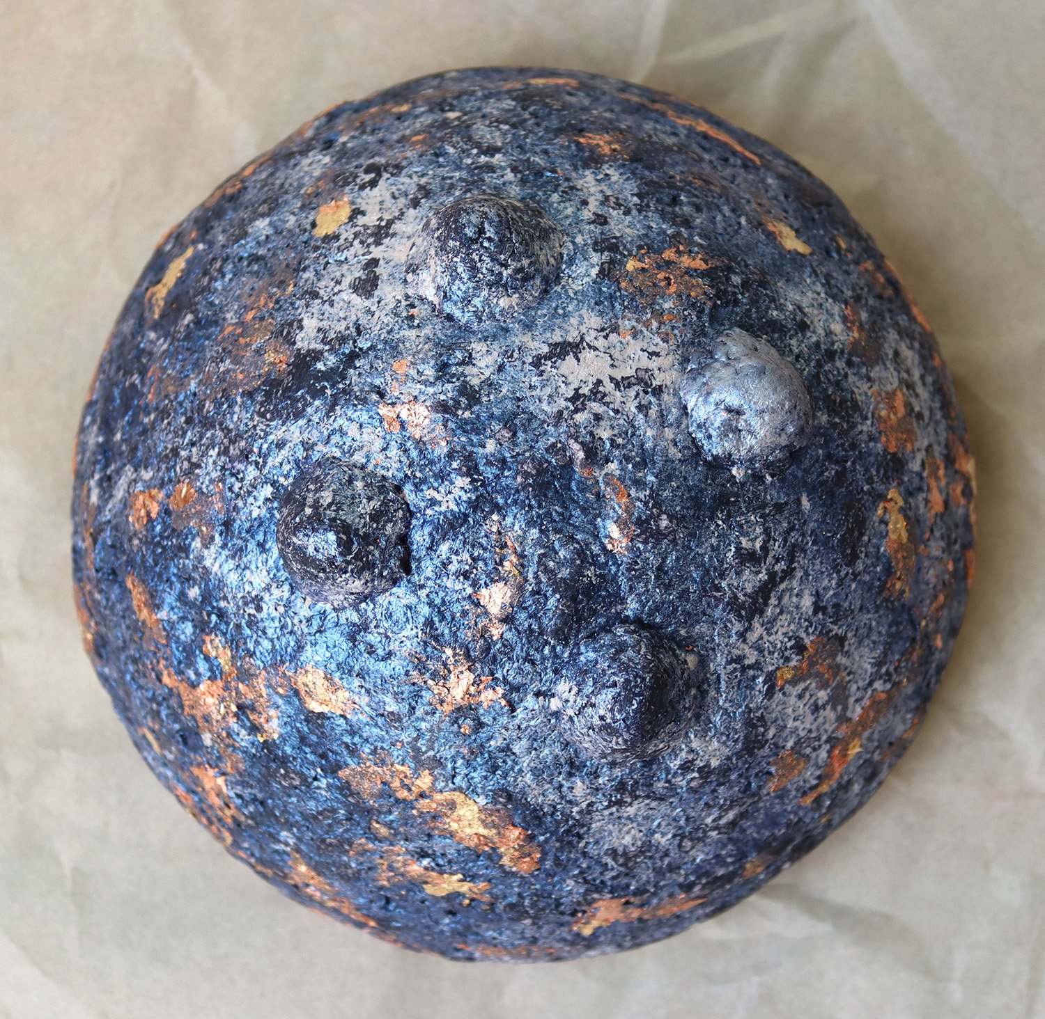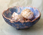 Bring a touch of the seaside into your home with this unique handmade paper mache bowl in calming blue tones. Adorned with seashell and starfish decoupage, it features a warm bronze rim and four sturdy legs for a charming, elevated look. Crafted from recycled paper, this eco-friendly piece is perfect as a decorative centerpiece, a catchall for small treasures, or a thoughtful gift for ocean lovers.