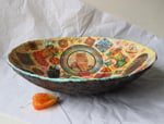 Bring the warmth of the holidays into your home with this joyful handmade paper mache bowl. Adorned with charming Christmas details — a cozy cat, wreaths, mittens, feathers, and colorful hearts — it captures the spirit of winter celebrations in a vibrant, artistic way.