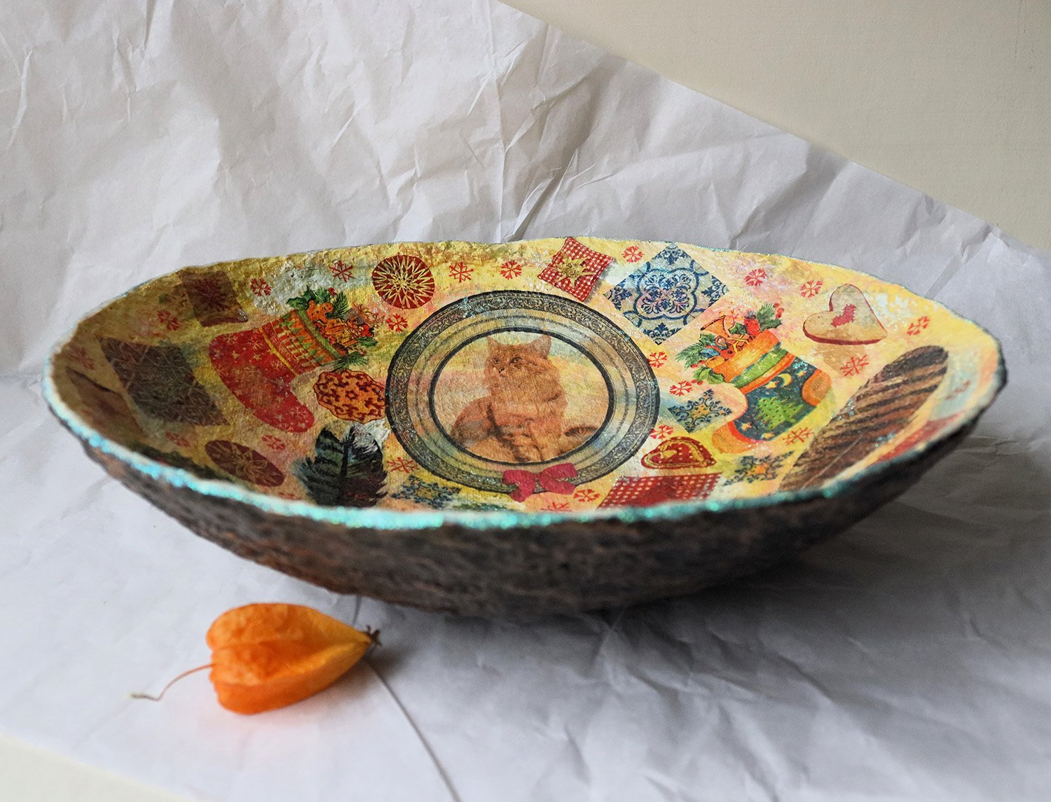 Bright and cheerful handmade paper mache bowl decorated with Christmas motifs — cat, wreath, mittens, hearts, and festive patterns. A one-of-a-kind eco-friendly decoration for the holiday season.