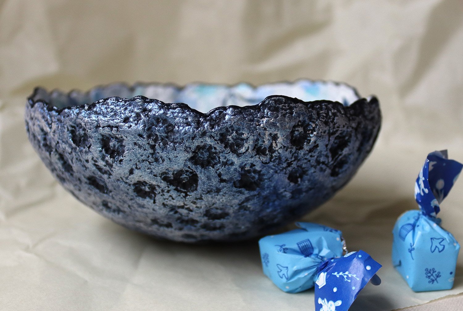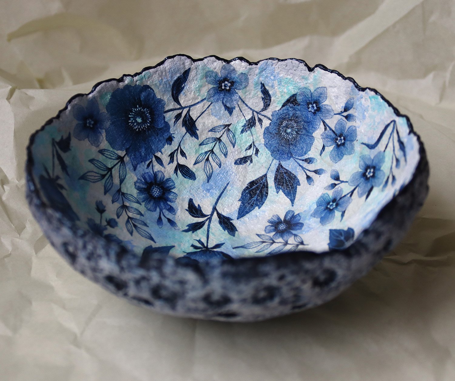 Unique handmade paper mache bowl with blue flower motif and dark blue exterior. Perfect as an artistic accent or nature-inspired home décor piece.