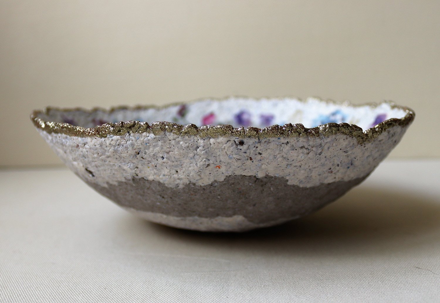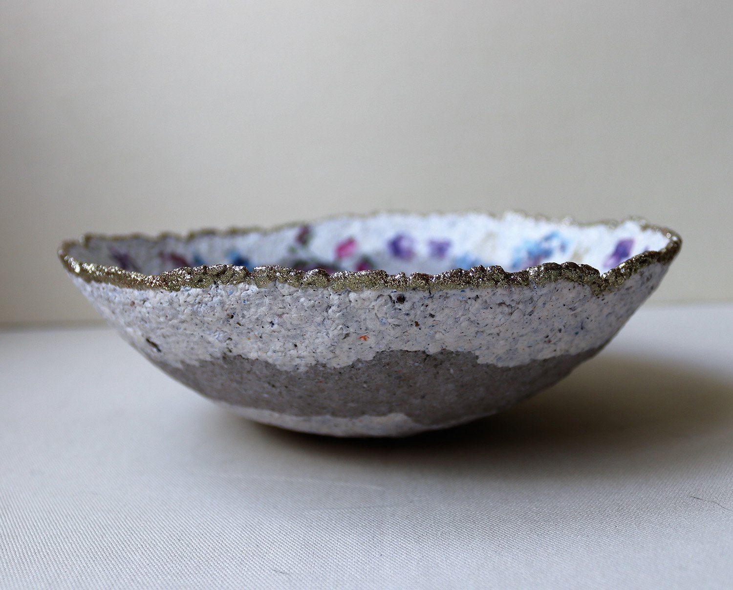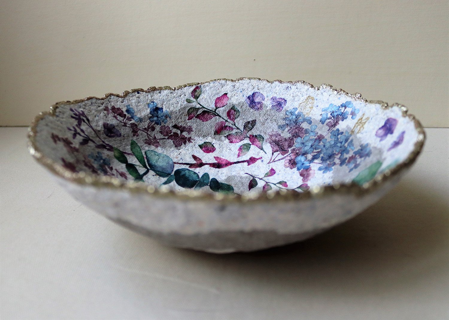 Romantic handmade paper mache bowl featuring violet flowers, eucalyptus leaves, and a shimmering gold rim. Eco-friendly decor for unique homes.