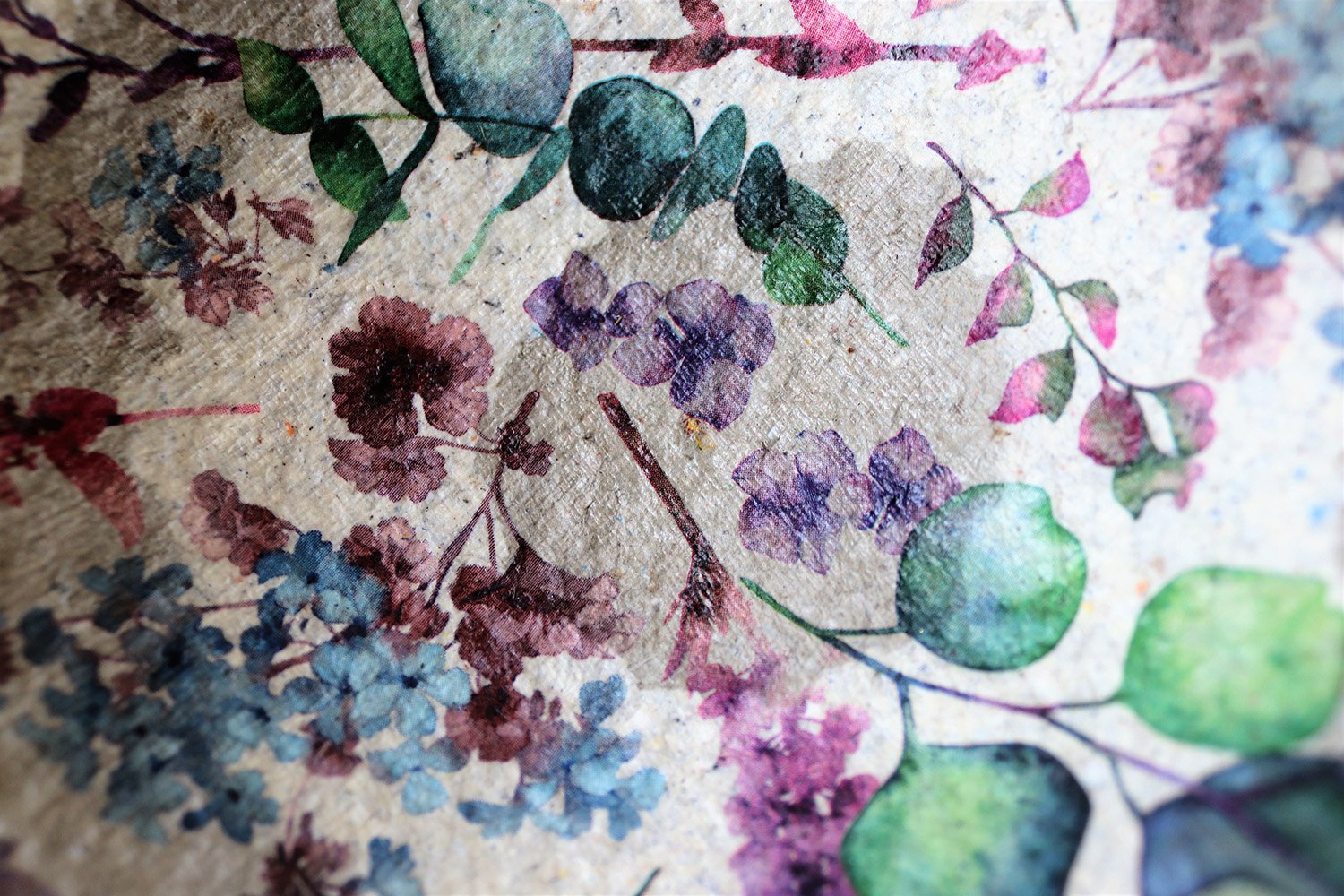 Bring a touch of romance and nature into your home with this handmade paper mache bowl. Decorated with delicate violet blossoms and eucalyptus leaves, the design feels fresh and timeless, while the shimmering gold rim adds a refined accent. Crafted from recycled paper, this eco-friendly bowl is both sustainable and artistic — a perfect decorative piece for any modern interior.