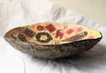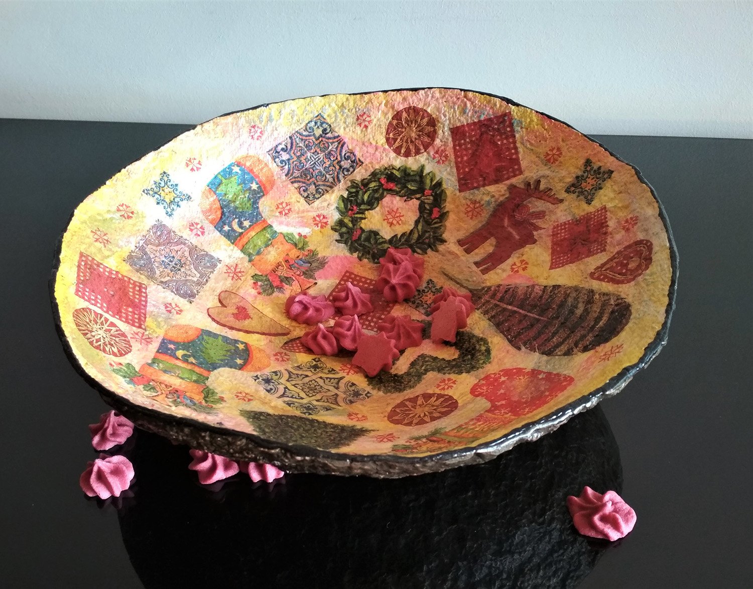 Each bowl is carefully shaped from recycled paper, hand-decorated with decoupage art, and sealed with a protective shimmer finish. A beautiful accent for your festive table, mantel, or as a one-of-a-kind handmade gift.