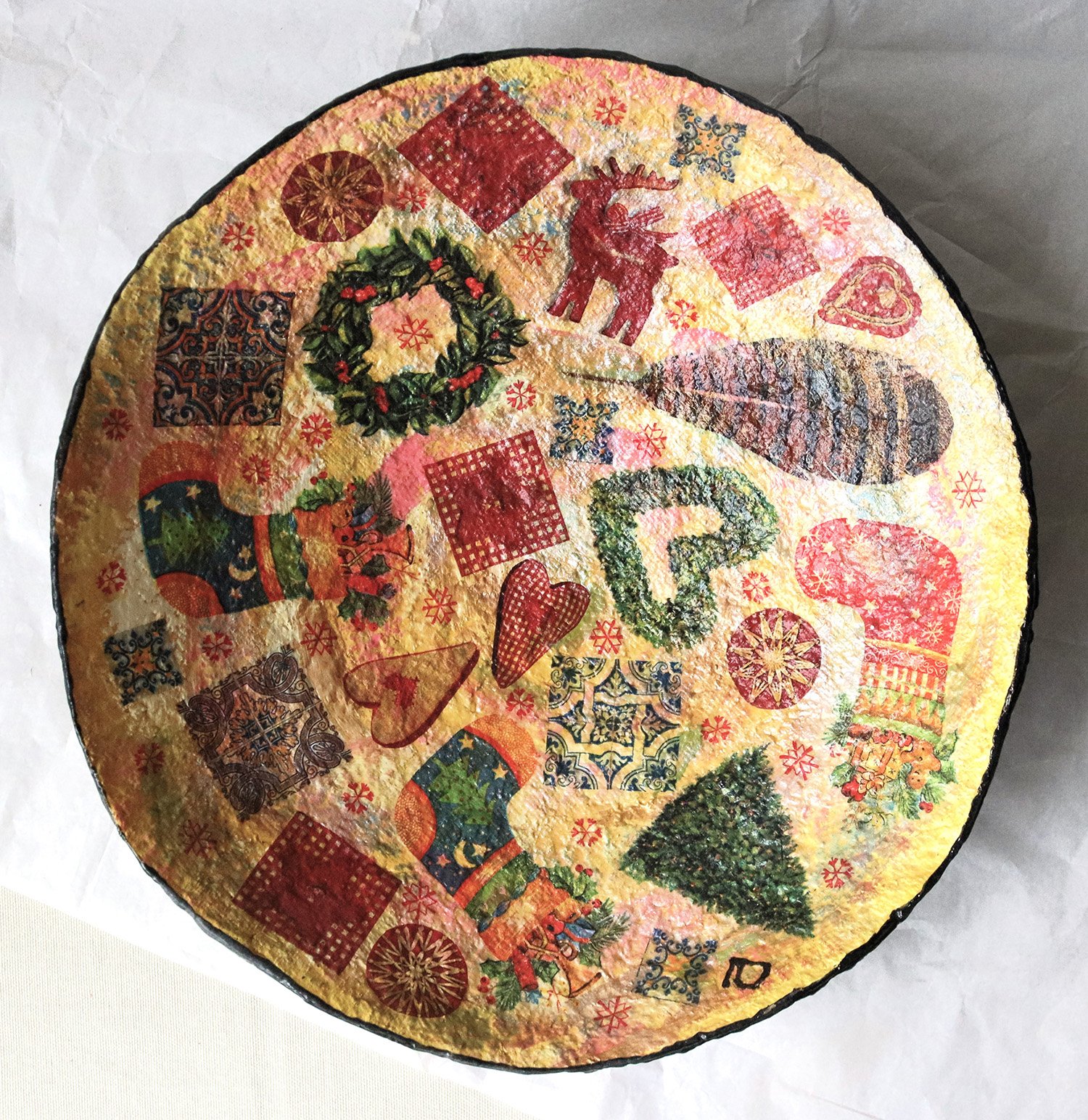 Celebrate the holiday season with this vibrant handmade paper mache bowl, filled with the cheerful charm of Christmas. Decorated with festive symbols — holly wreaths, cozy stockings, hearts, feathers, and Christmas trees — it captures the cozy and colorful essence of winter joy.