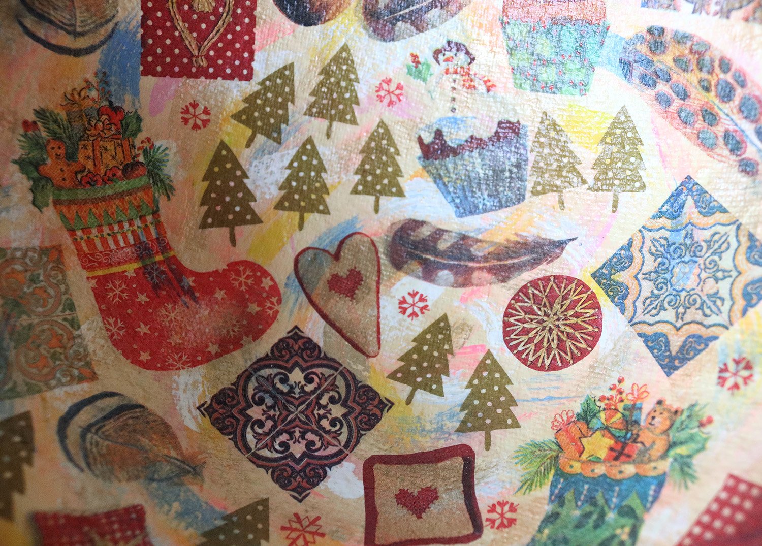 Inside the bowl, you'll find a lively collage of holiday motifs: Christmas trees, ornaments, patterned squares, snowflakes, and winter elements arranged in a warm, glowing decoupage design. The result is playful, cozy, and full of nostalgic holiday spirit.