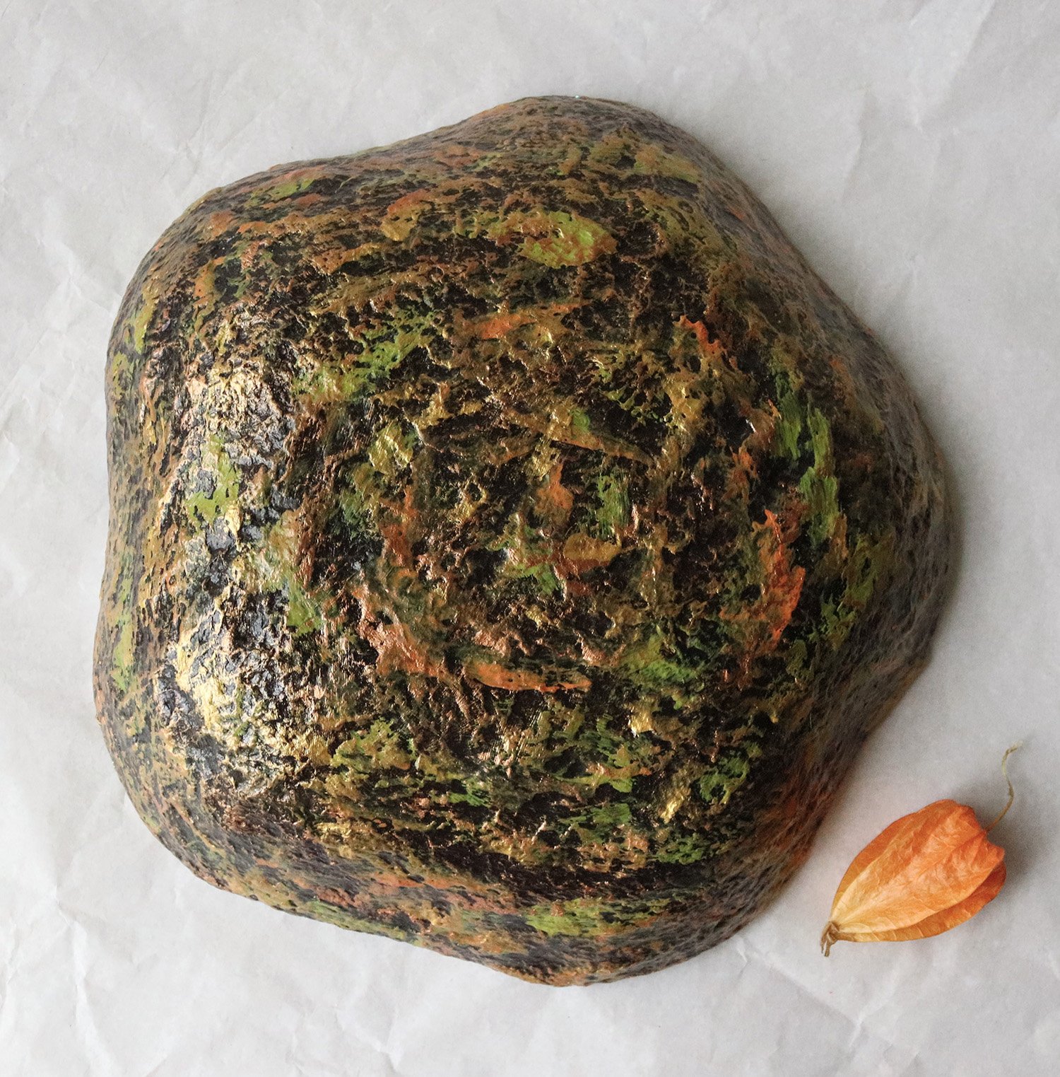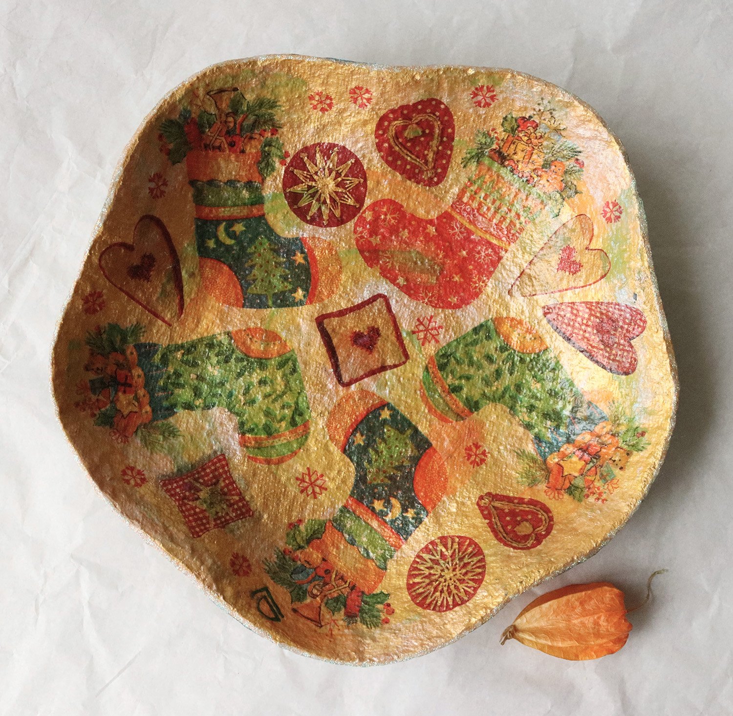 Bring the warmth and joy of Christmas into your home with this beautiful handmade papier-mâché bowl. Decorated using festive decoupage motifs — colorful stockings, hearts, winter florals, stars, and golden accents — this piece immediately creates a cheerful holiday atmosphere.