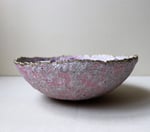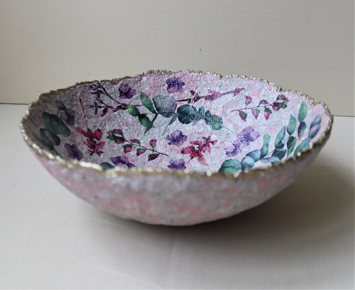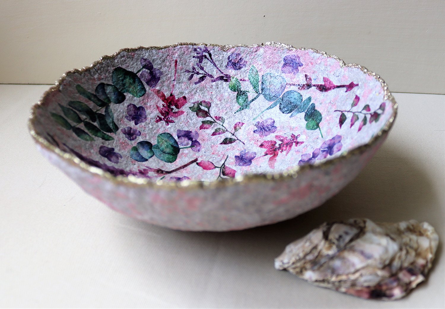 Romantic handmade paper mache bowl featuring violet flowers, eucalyptus leaves, and a shimmering gold rim. Eco-friendly decor for unique homes.