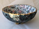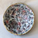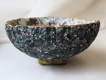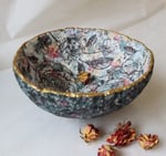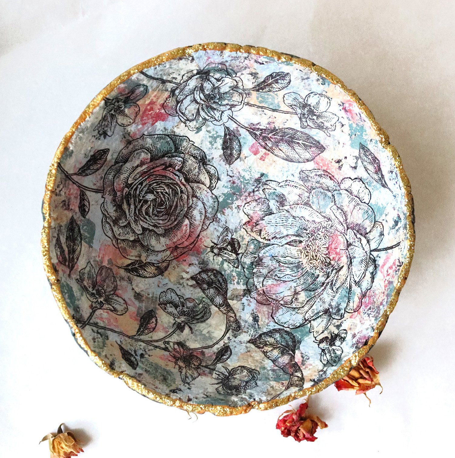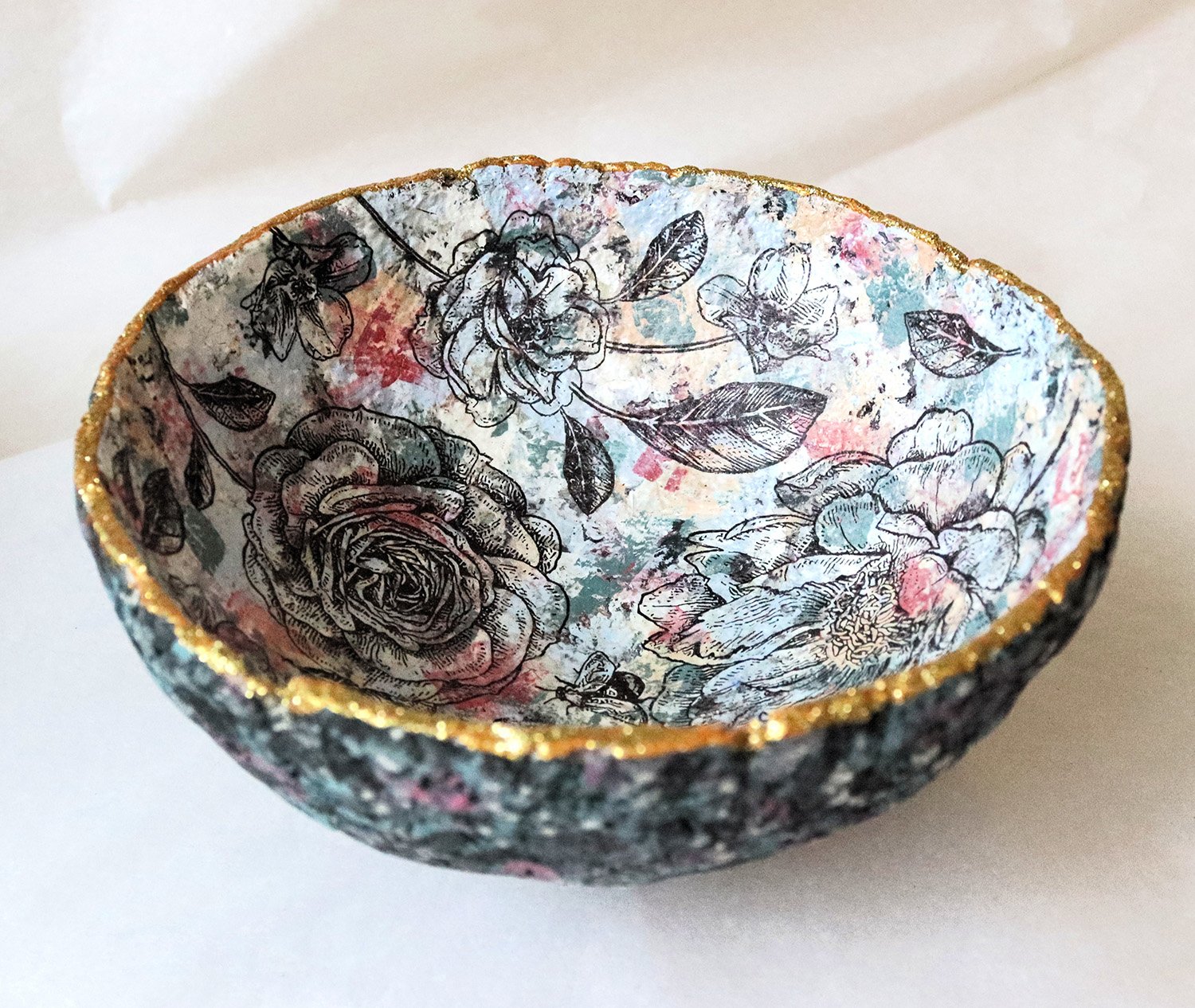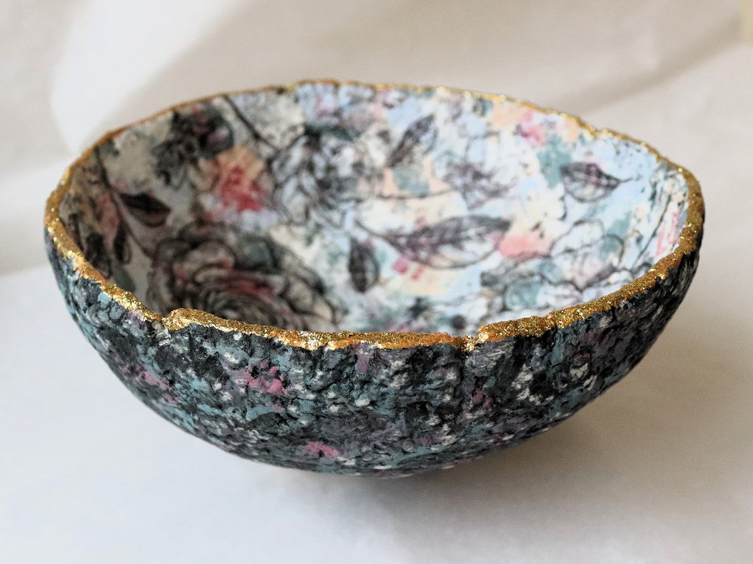 Handmade paper mache bowl made from recycled paper. Floral decoupage interior, textured exterior and gold rim. One-of-a-kind eco-friendly decor.