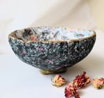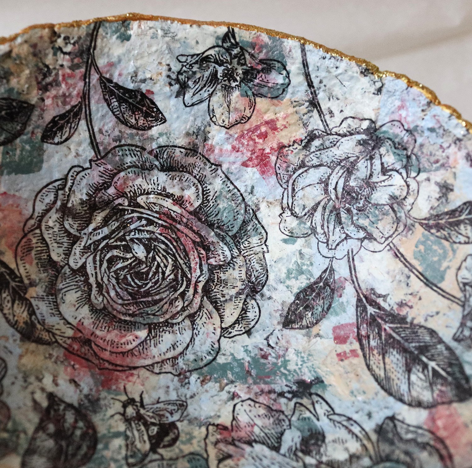 The interior features a delicate floral decoupage with roses and peonies, layered over a softly textured surface. The exterior is dark and tactile, finished with a subtle gold accent along the rim, highlighting the organic shape of the bowl.