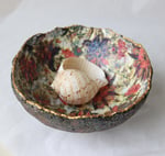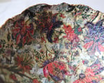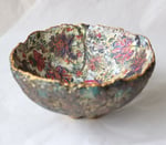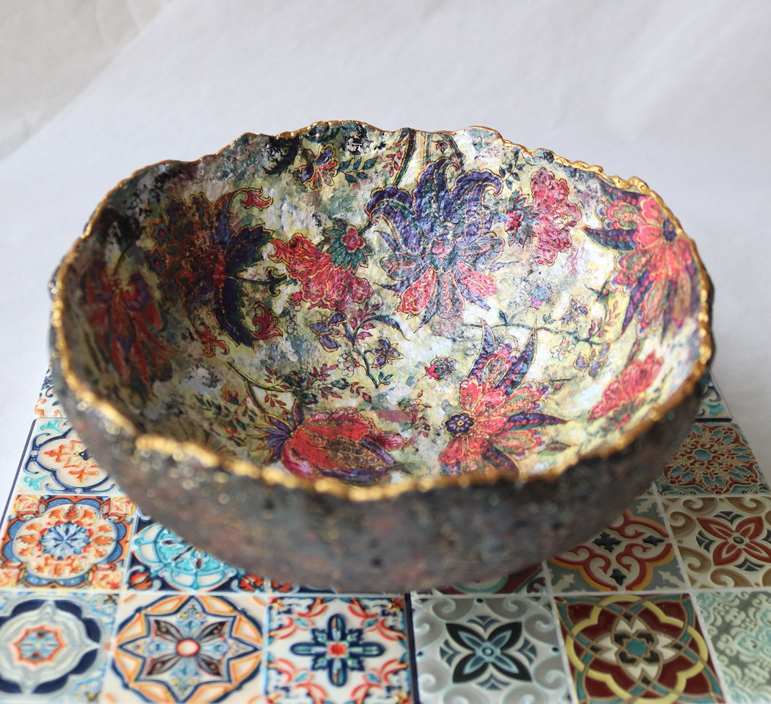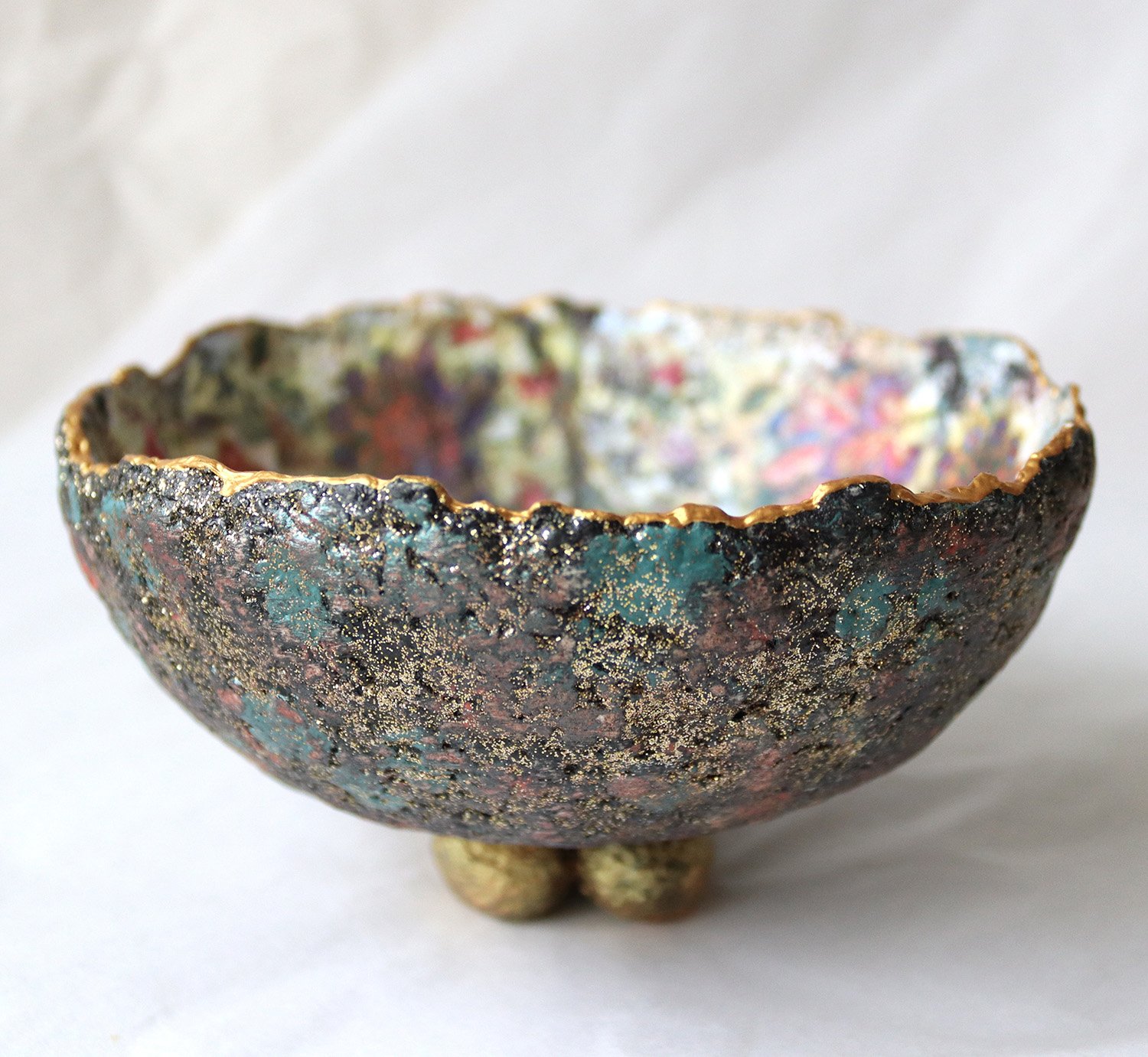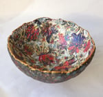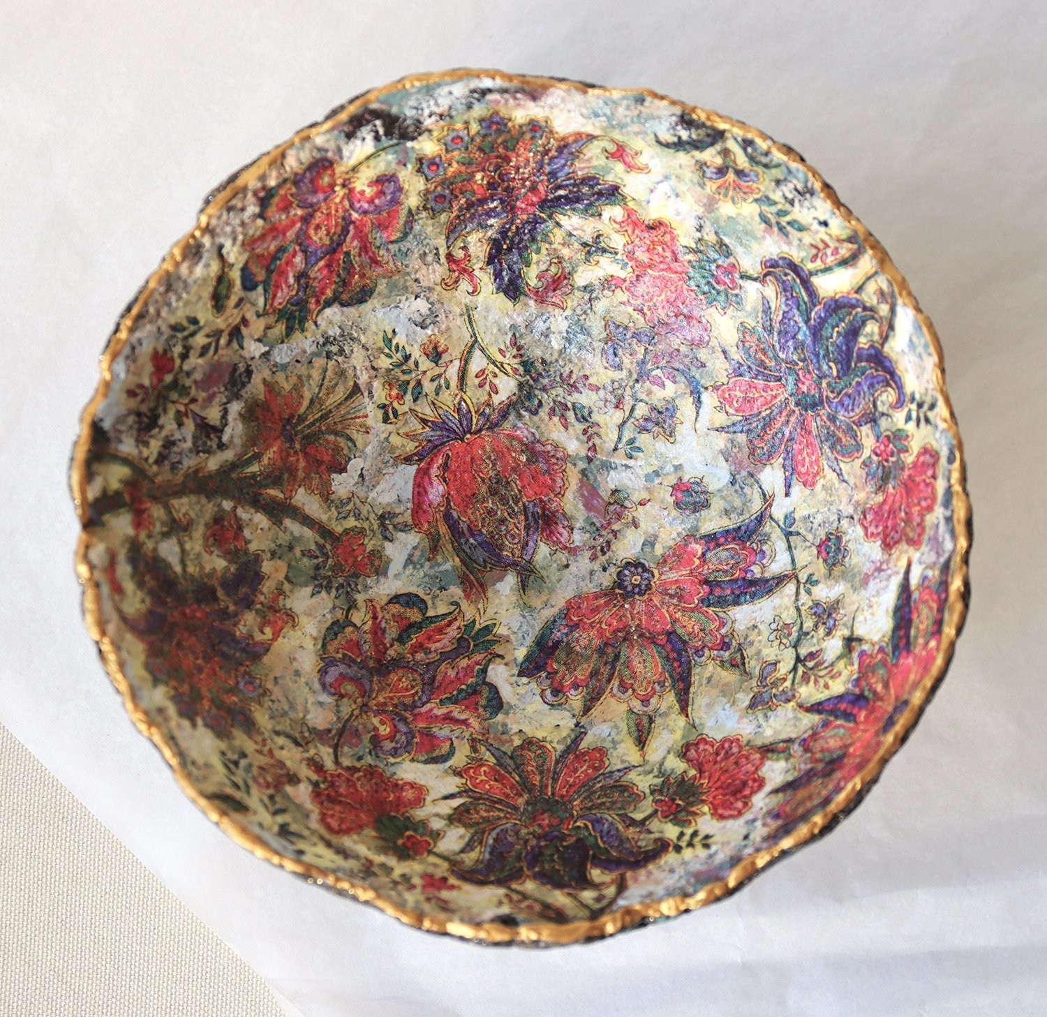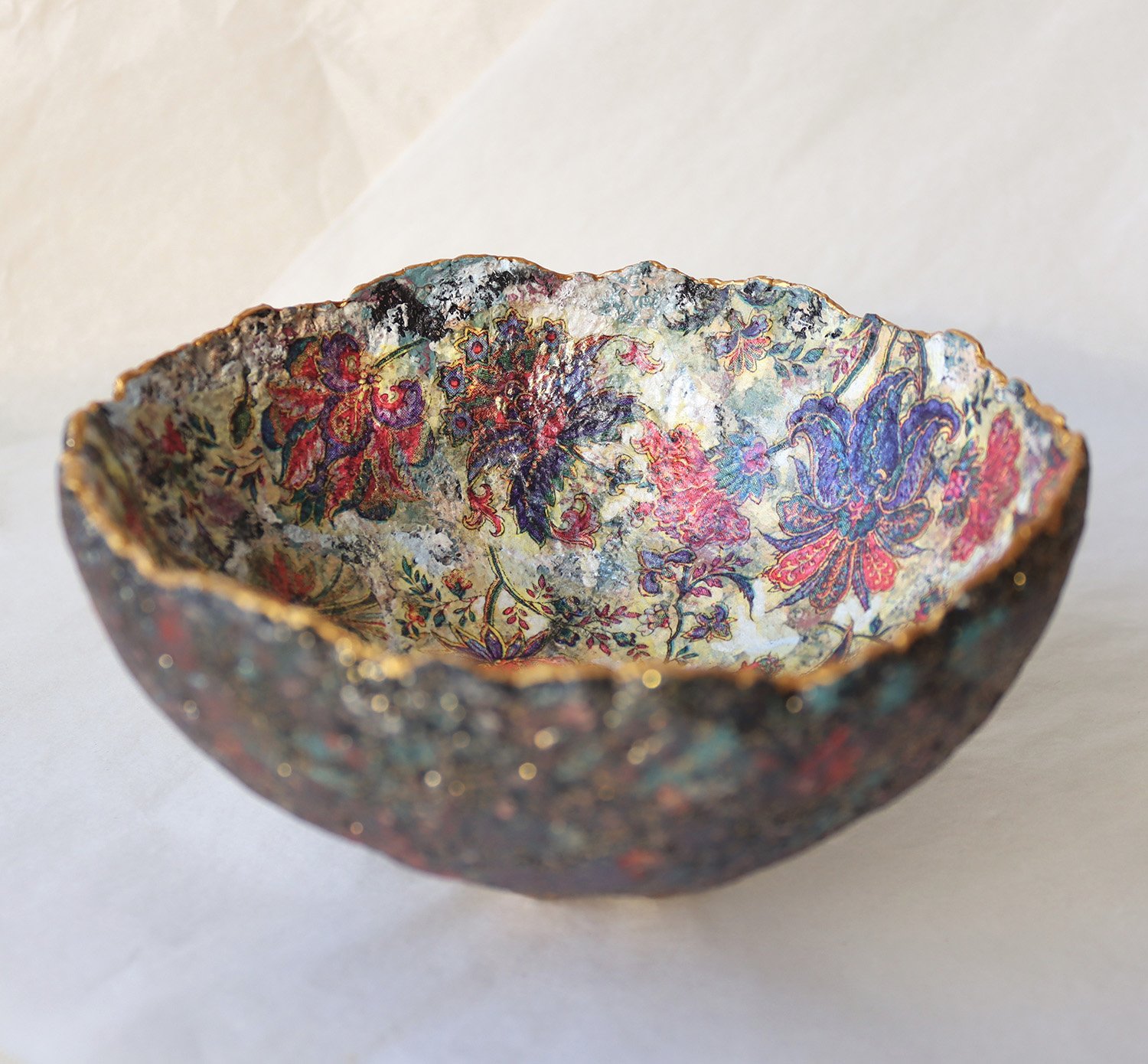 One-of-a-kind handmade paper mache bowl with rich oriental floral interior and textured exterior. Sustainable decorative art crafted from recycled paper.