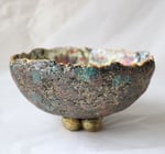 The exterior carries a richly textured, stone-like finish in deep teal and earthy tones, softly dusted with golden accents. The irregular gold-edged rim enhances its handcrafted character and adds a refined touch.