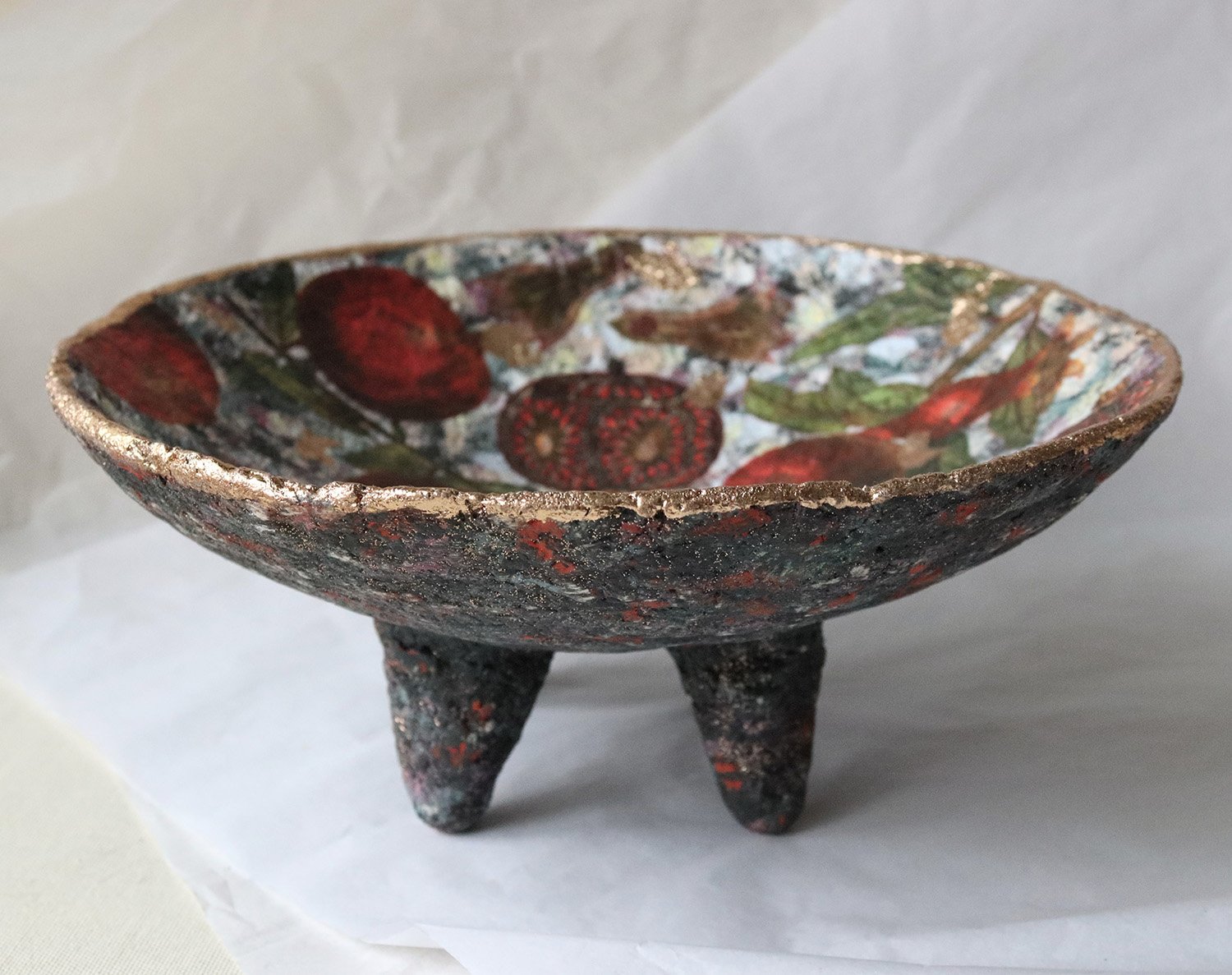 One-of-a-kind handmade paper mache bowl inspired by pomegranates. Created from recycled paper with a rustic exterior and subtle gold rim. Sustainable art decor by ArtMood.