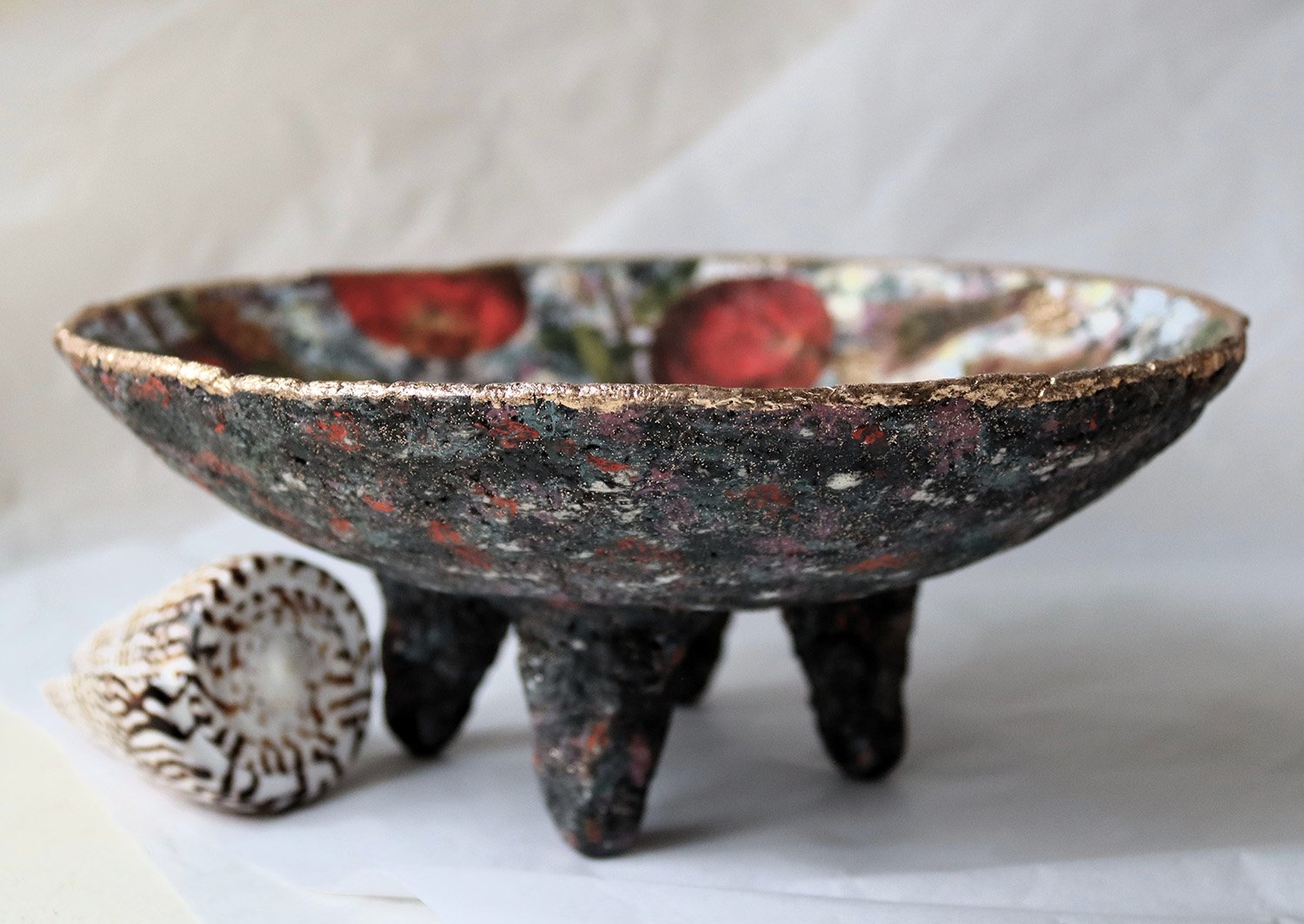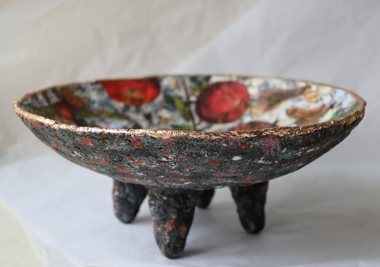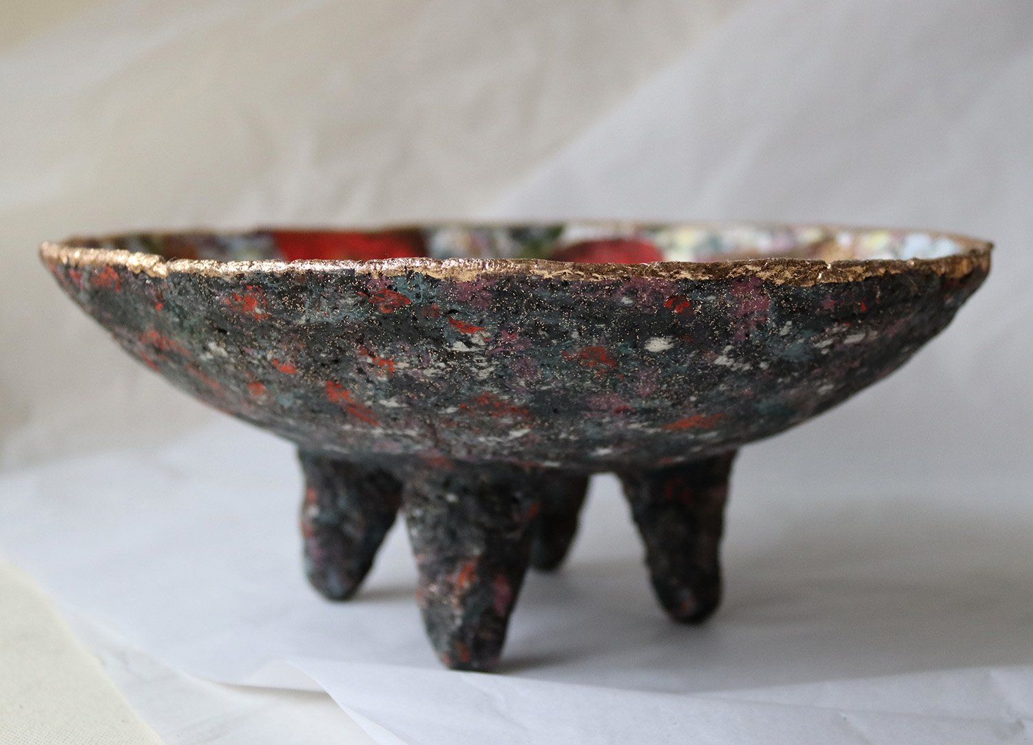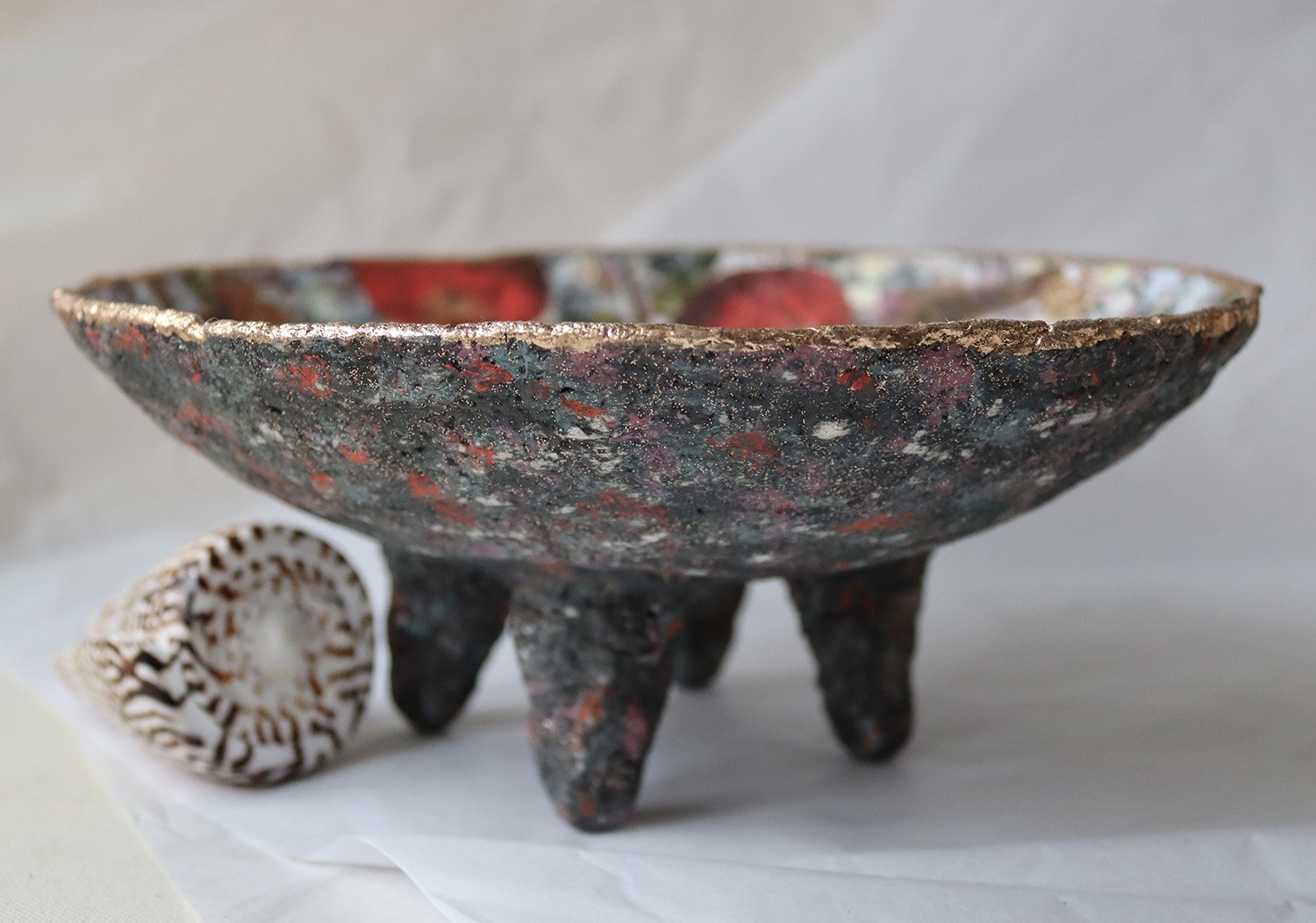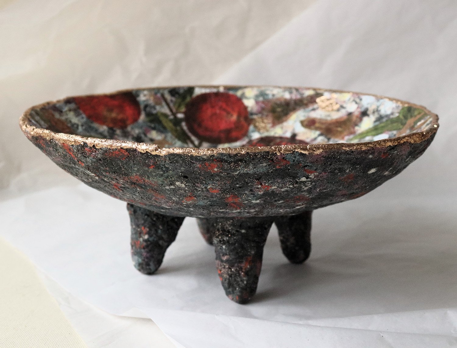 The bowl stands on sculptural legs, giving it a grounded yet organic presence. Designed as an art object rather than functional tableware, it works beautifully as a centerpiece, shelf accent, or soulful interior detail.