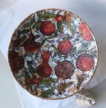 This one-of-a-kind handmade paper mache bowl is inspired by the rich symbolism and warmth of pomegranates. The interior features expressive botanical imagery, while the exterior has a dark, rustic texture with subtle color accents and a delicate gold-painted rim.