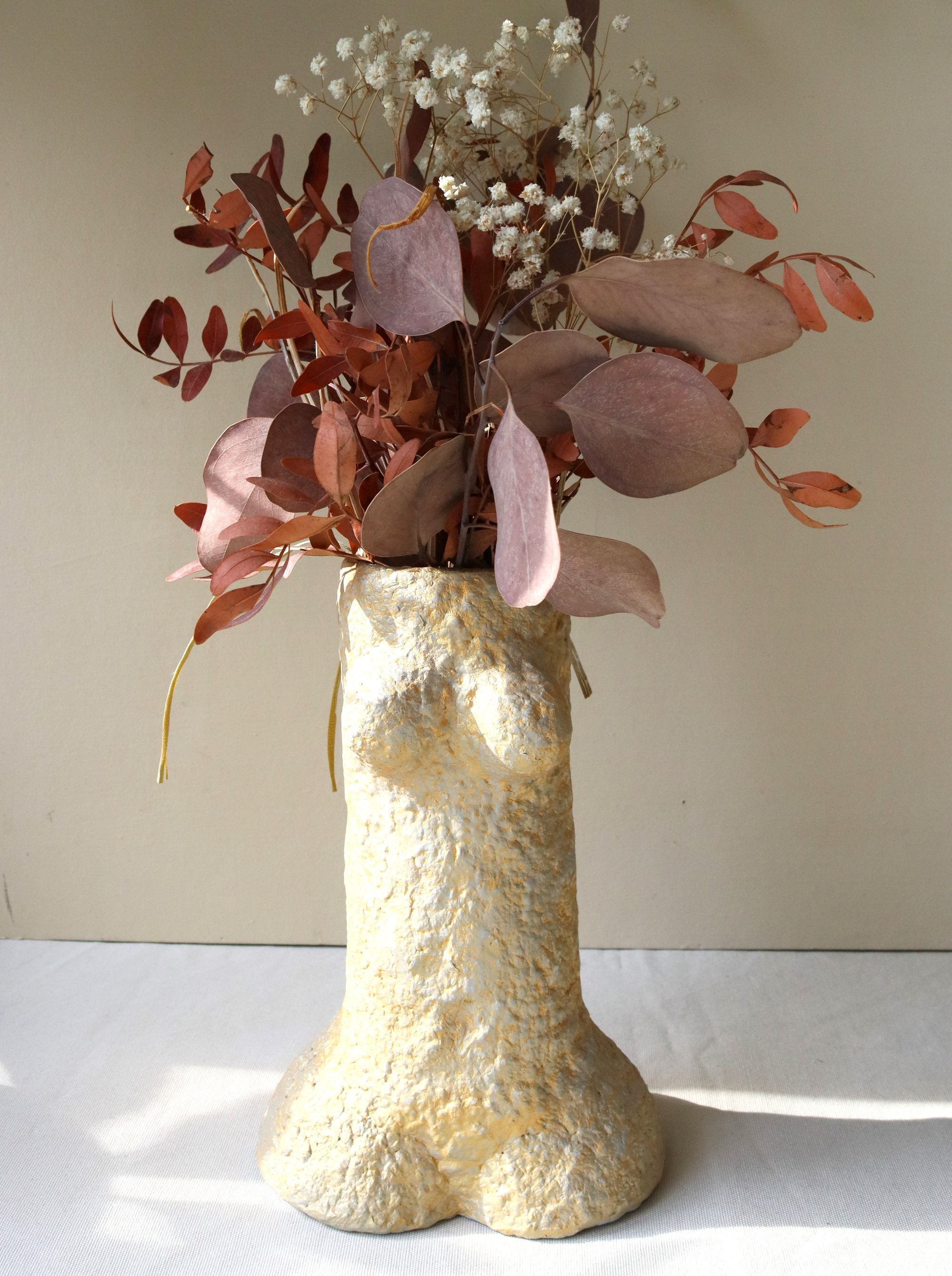 This handmade papier mache vase is a sculptural piece inspired by the beauty of the human form. With its textured surface and natural tones, it brings an artistic and raw elegance to any space. Perfect for dried or artificial flowers, or simply displayed as an art object, this body-inspired vase embodies both strength and vulnerability. Crafted from recycled materials, it’s a sustainable decor piece that celebrates individuality and creativity.