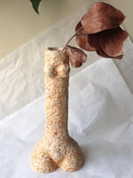 The textured surface and warm earthy tones give the piece an organic character, while the elongated shape adds elegance and vertical presence to any interior. More than a simple vessel, this piece is designed as a decorative art object that celebrates the connection between nature, craft and the human form.