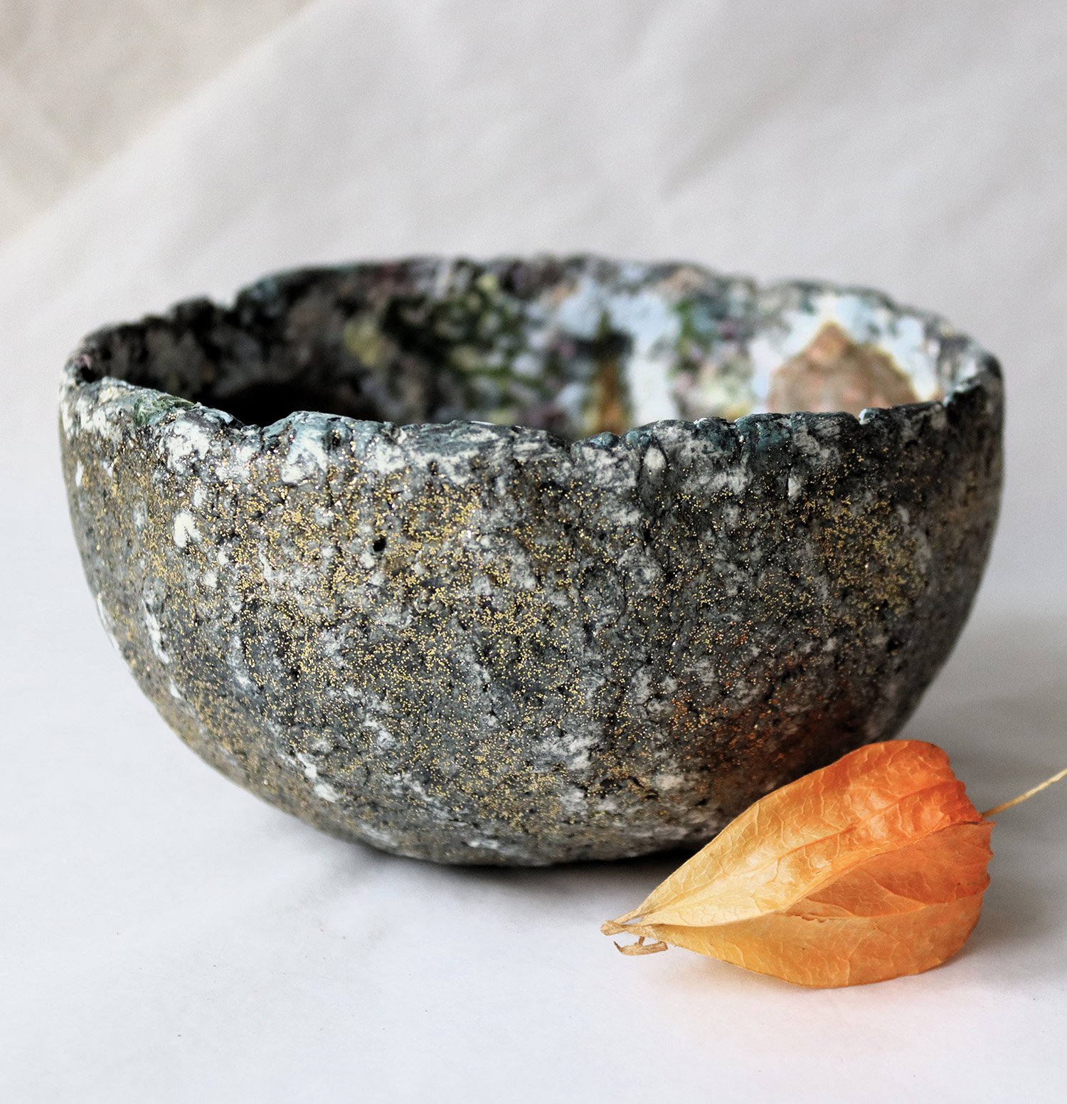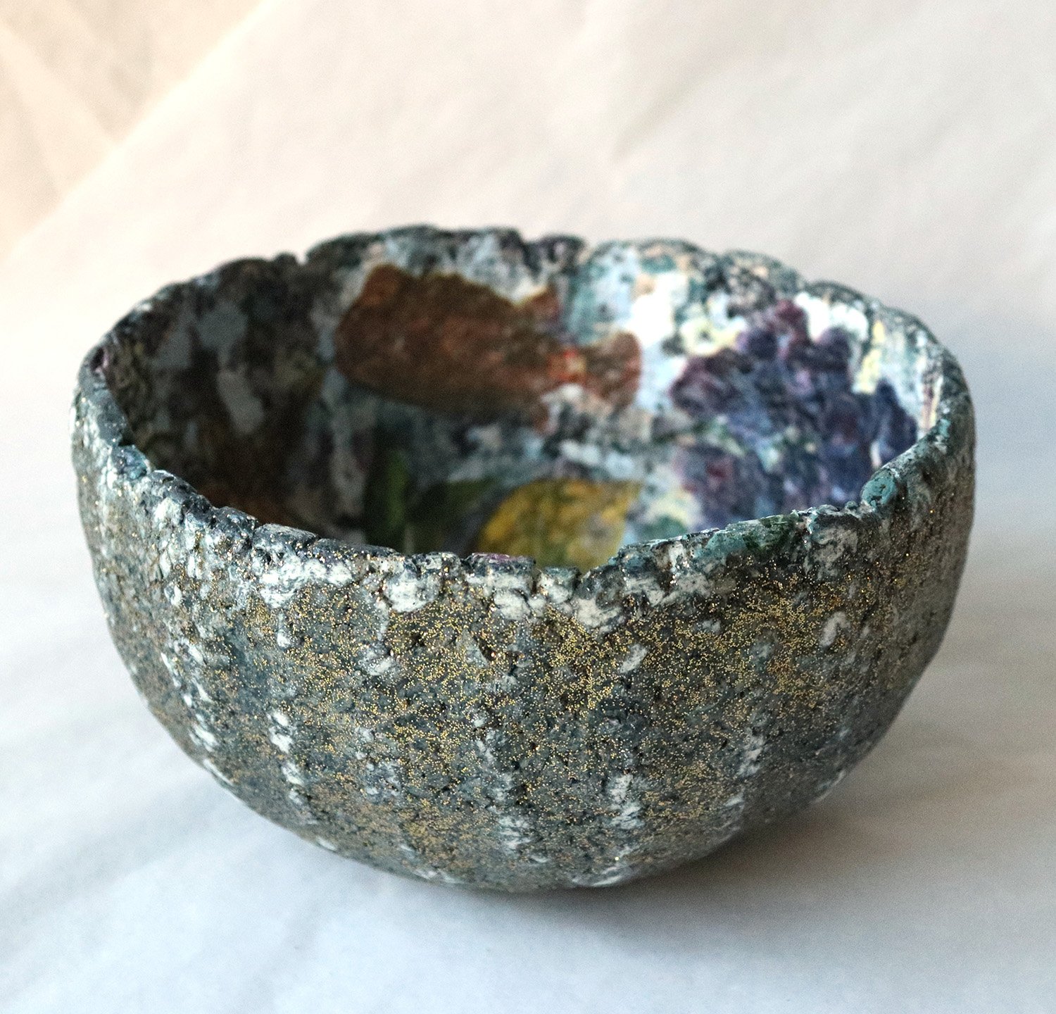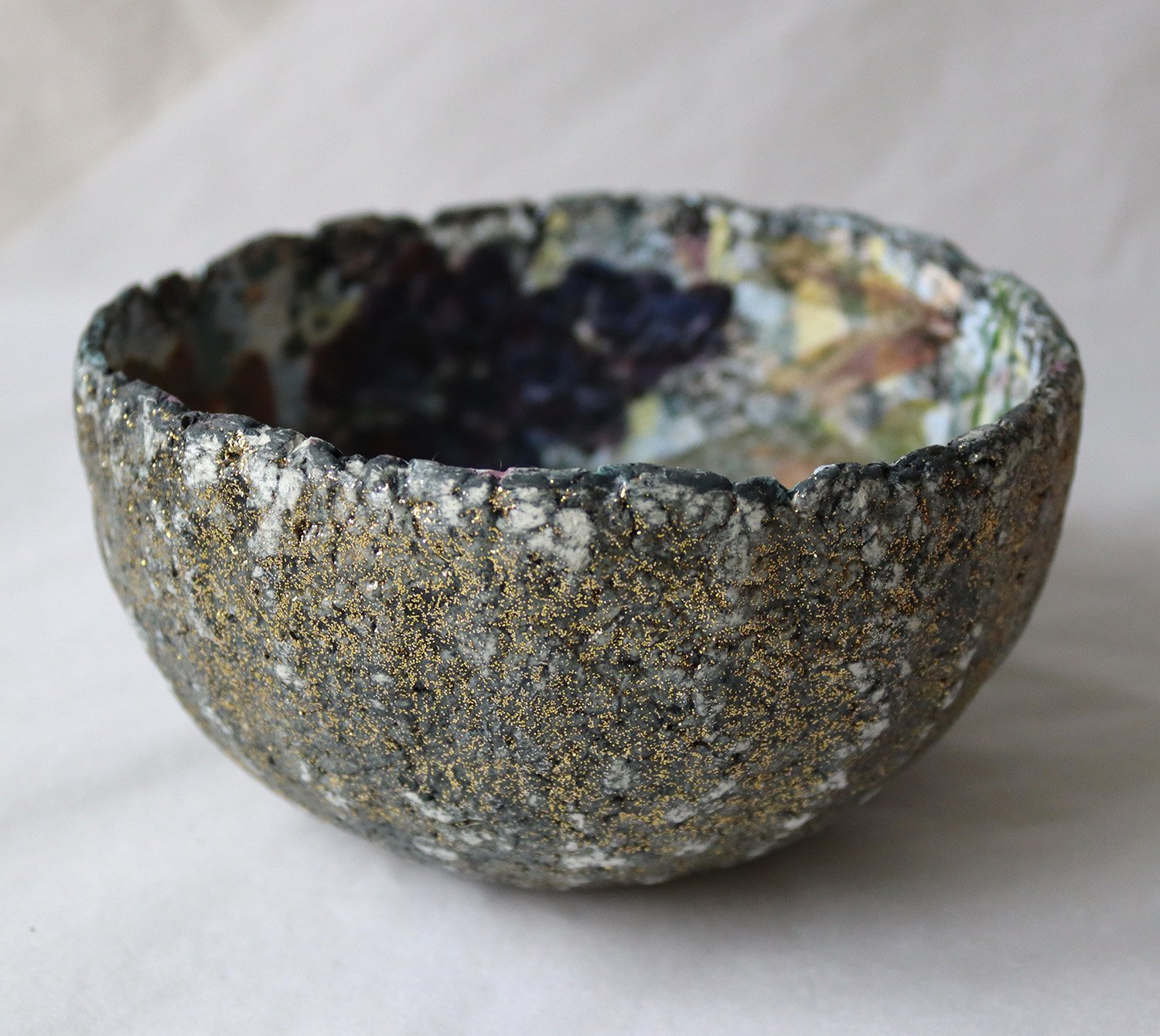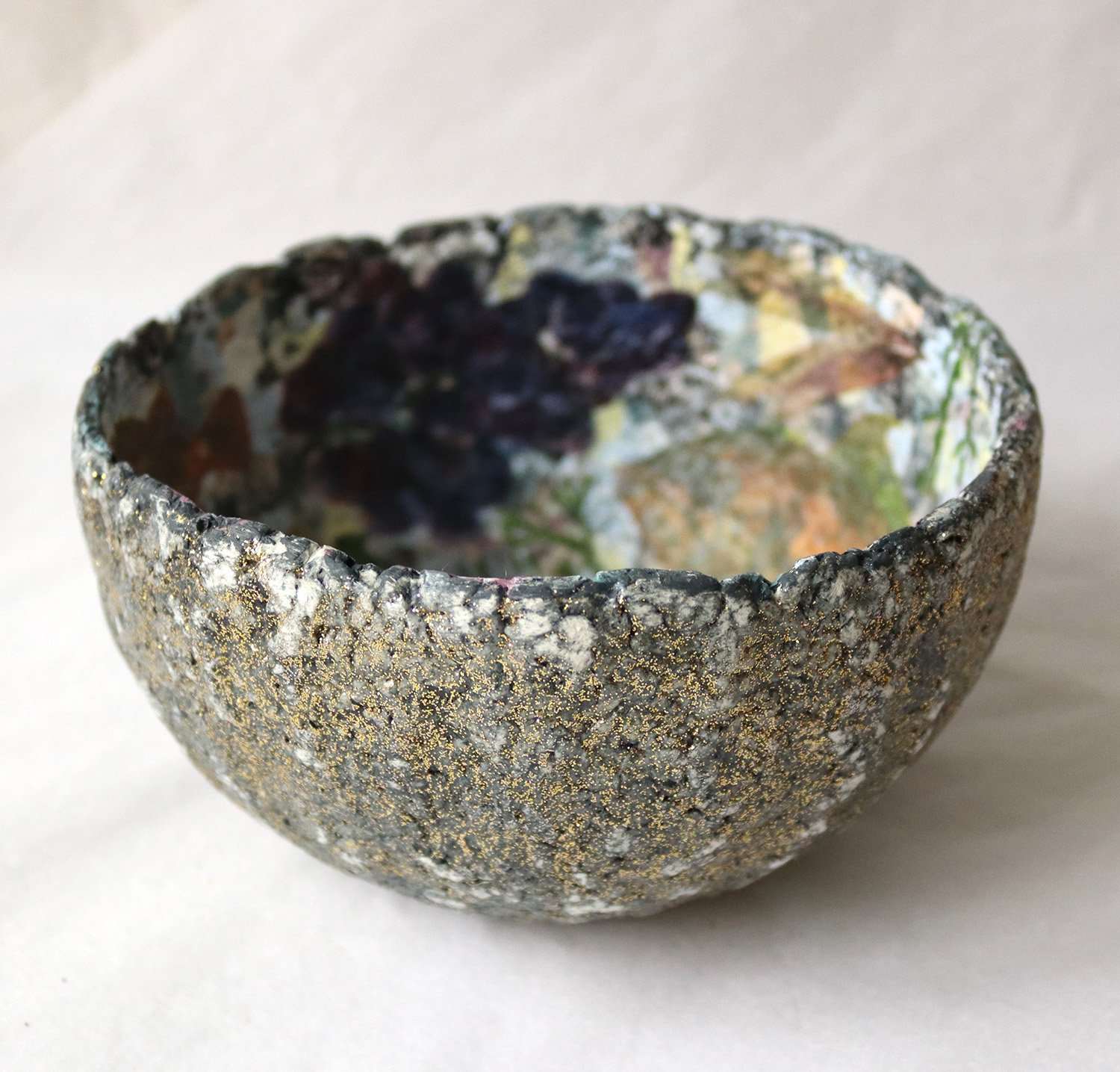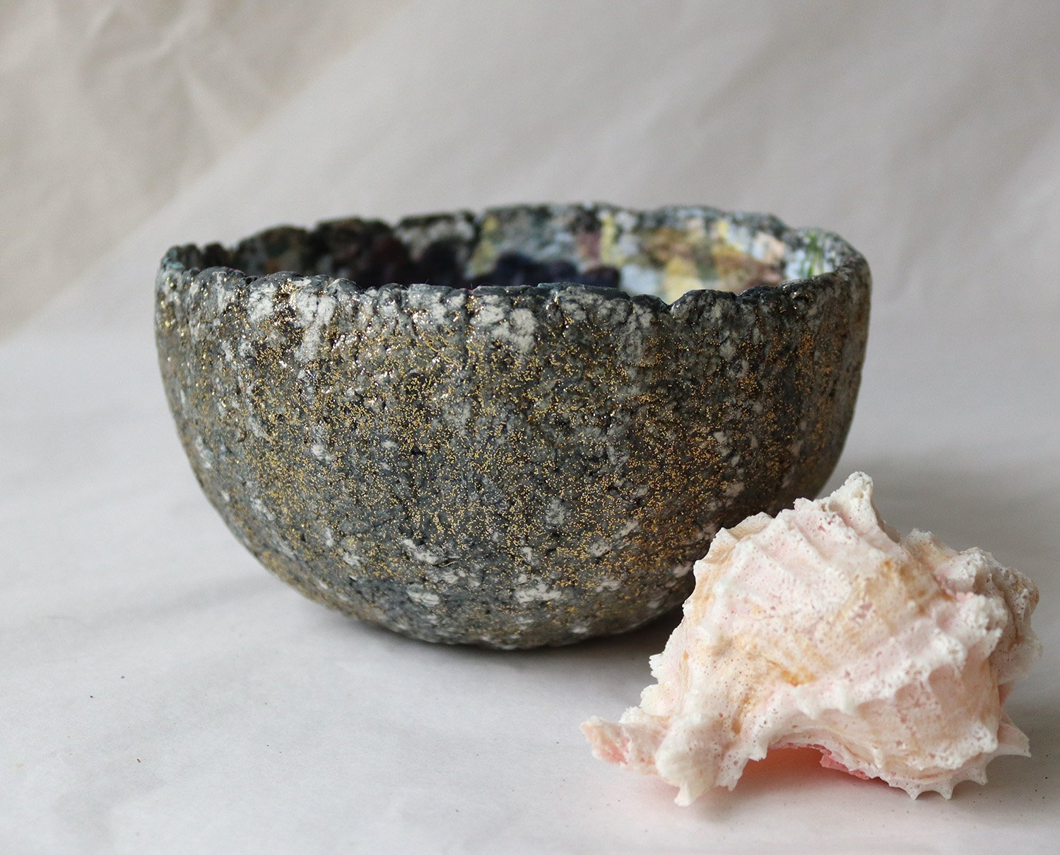 The exterior carries a stone-like, organic texture with subtle golden speckles along the rim — creating contrast between raw material and delicate interior imagery.