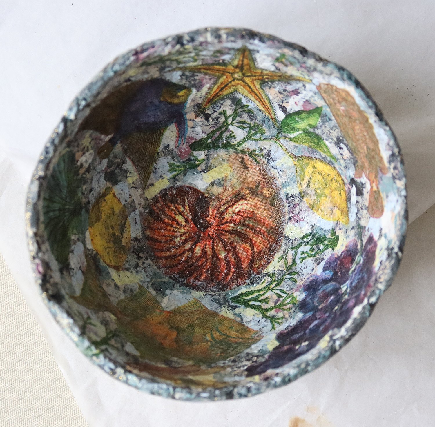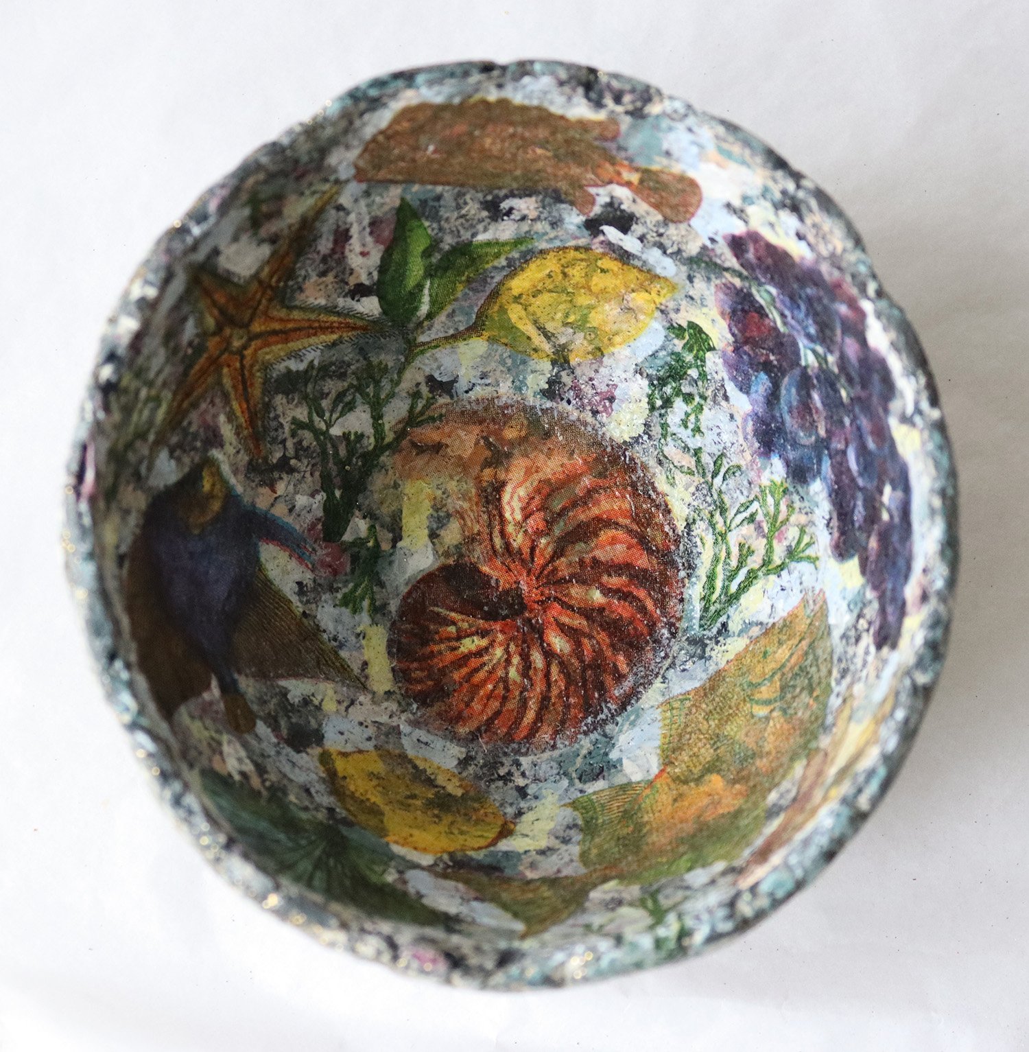 Luxury Handmade Paper Mache Bowl – Botanical & Marine Collage Art | Sustainable Home Decor
