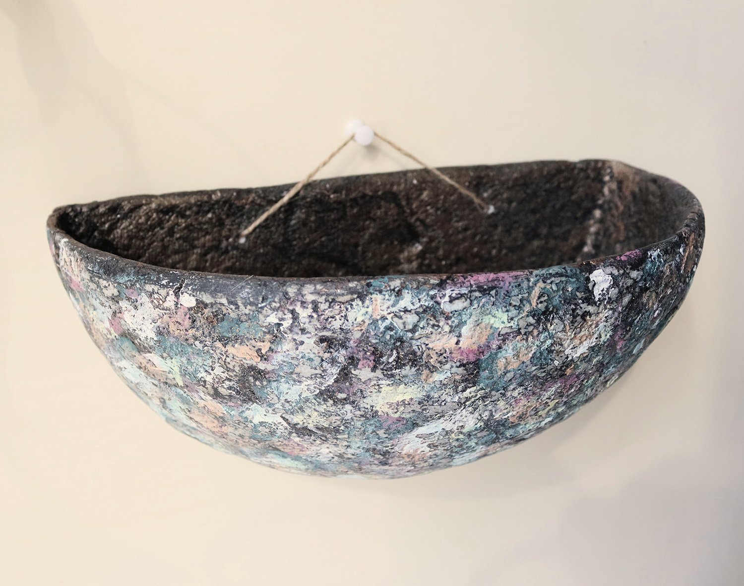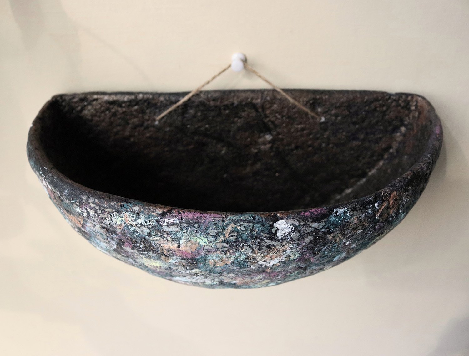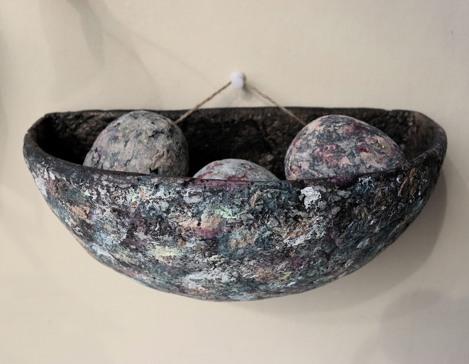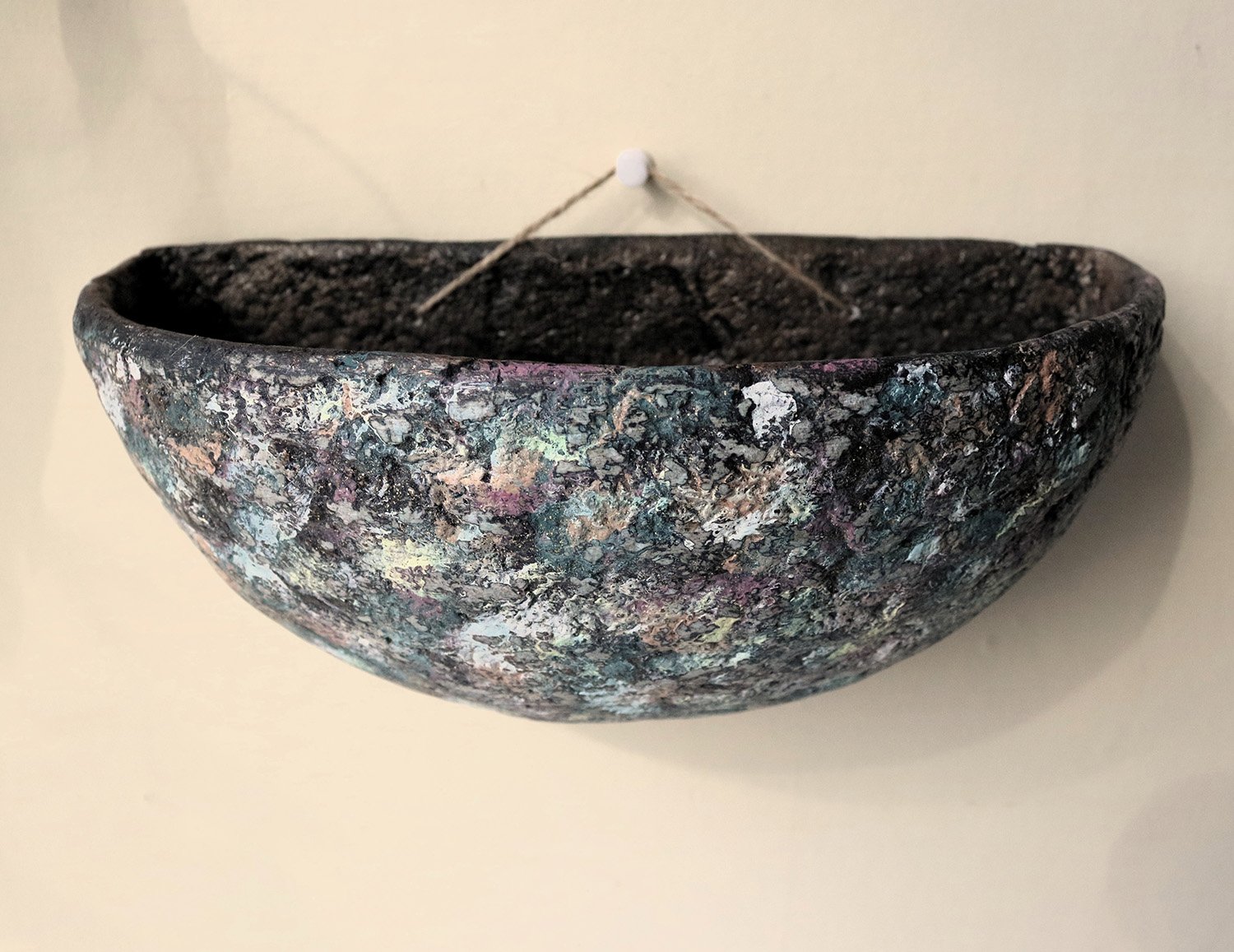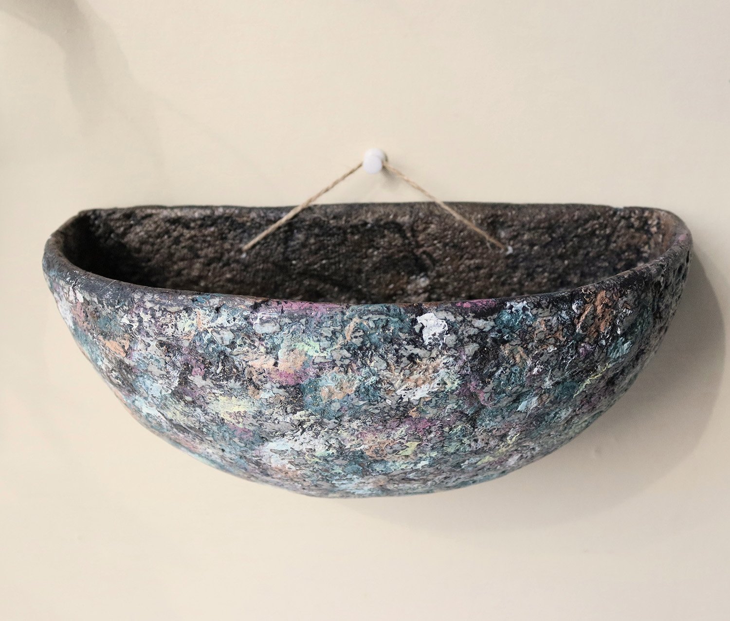 This unique wall-hanging bowl is handmade from recycled paper using traditional papier-mâché techniques. Designed as both a decorative object and a functional wall pocket, it combines sculptural form with natural texture.