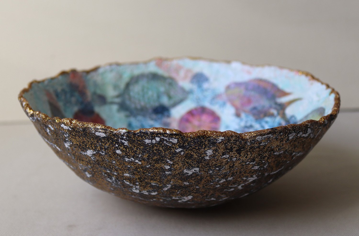 Sophisticated Handmade paper mache bowl with fish, seashell and jellyfish decoupage, antique gold exterior. Eco-friendly coastal decor inspired by the sea.