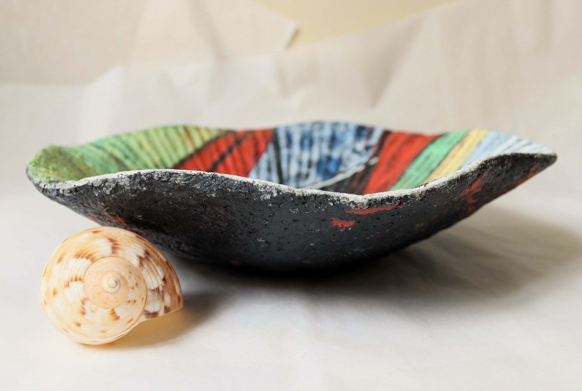 Handmade paper mache bowl inspired by Picasso’s abstract art. Colorful wavy design with bold geometric patterns — a unique statement decor piece.