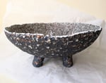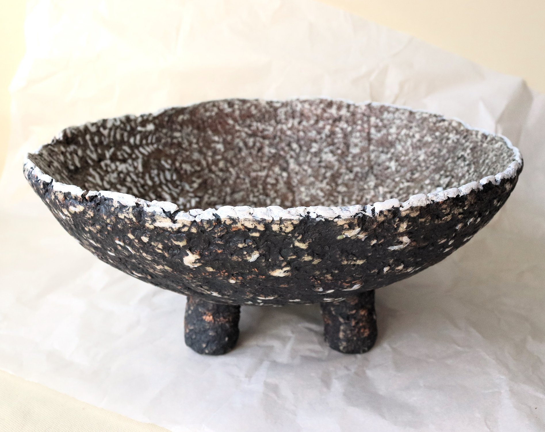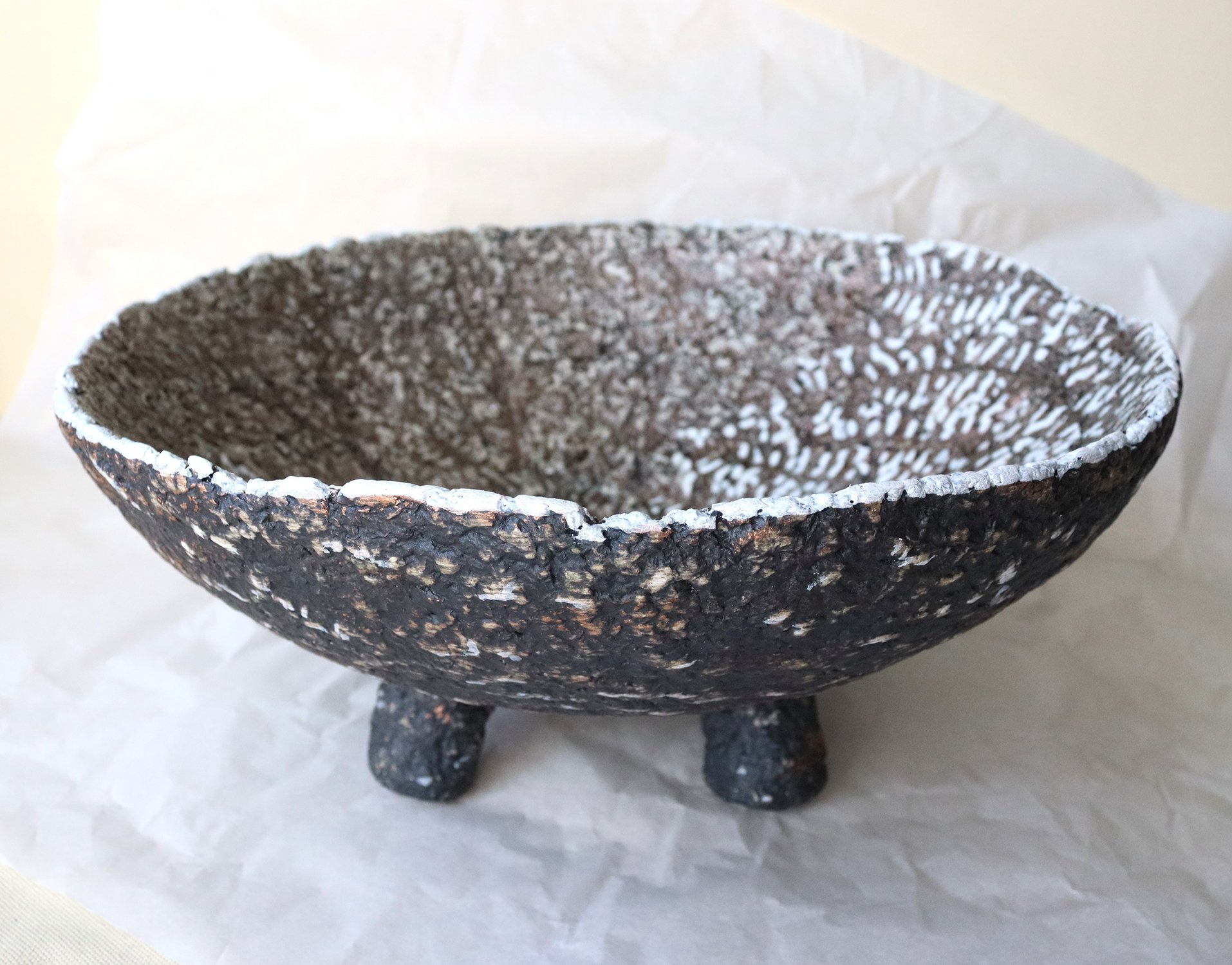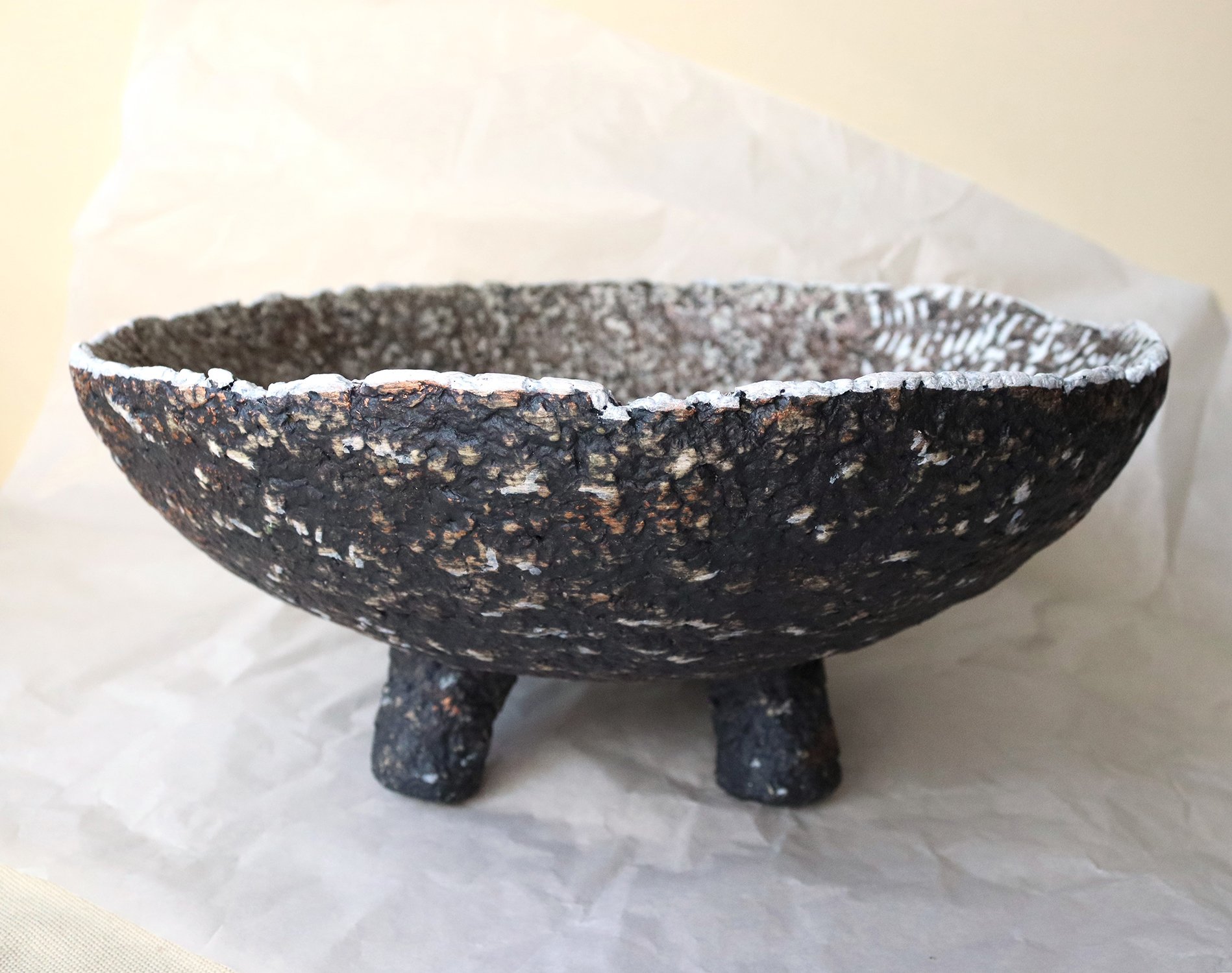This one-of-a-kind papier-mâché bowl is handcrafted with a raw, earthy texture and a subtle fern imprint that celebrates the beauty of nature. Supported by four small legs, it stands with a sculptural presence, making it not just a bowl but a piece of art. Its dark, organic tones with contrasting white accents give it a timeless, rustic charm. Perfect as a centerpiece, decorative accent, or a thoughtful handmade gift.