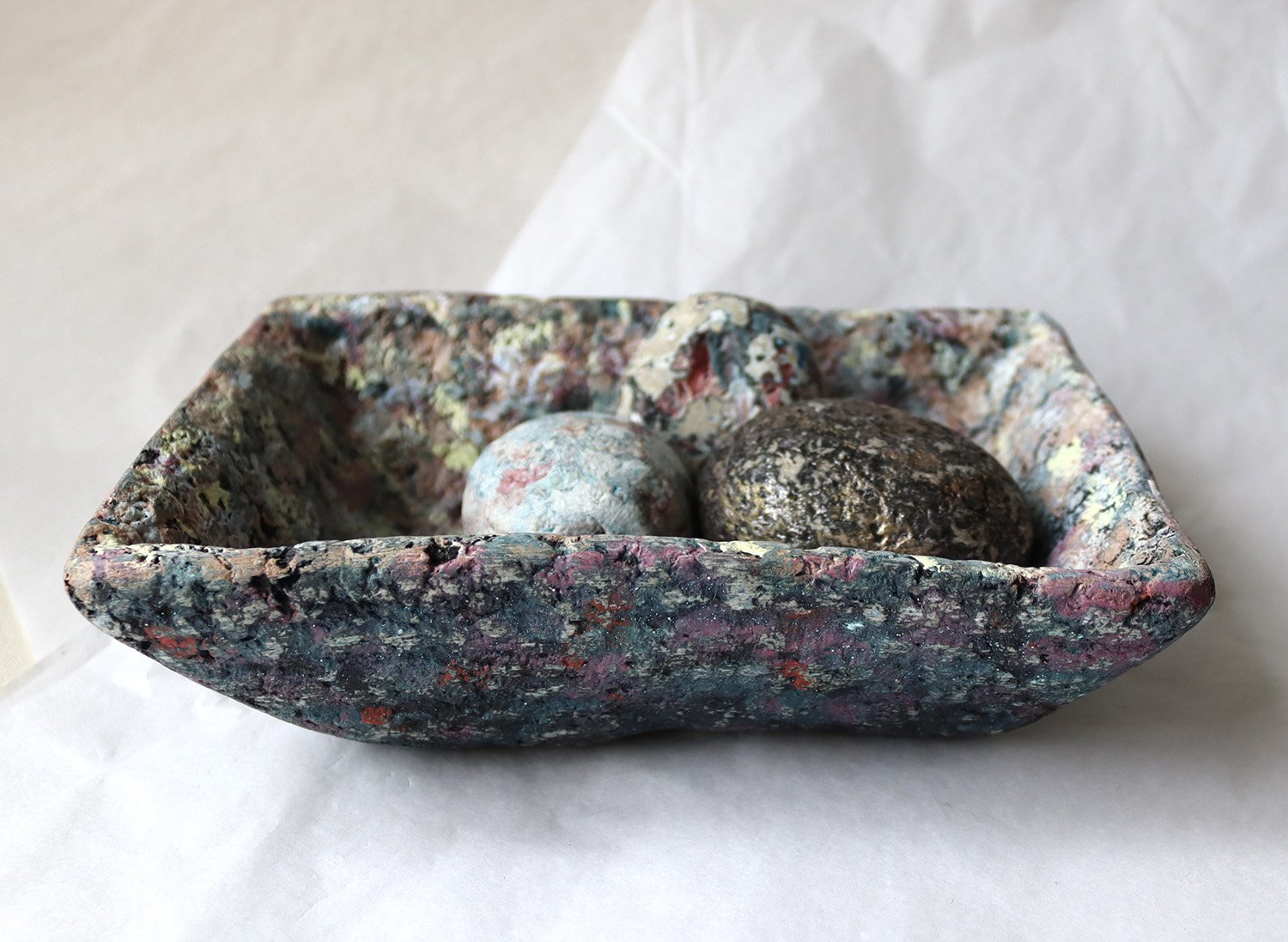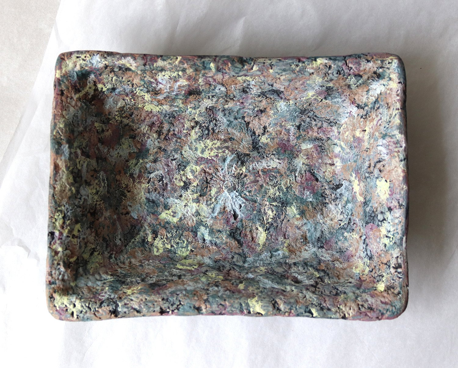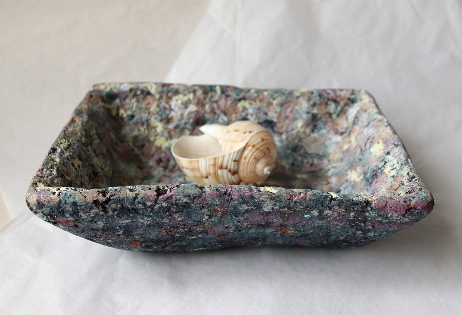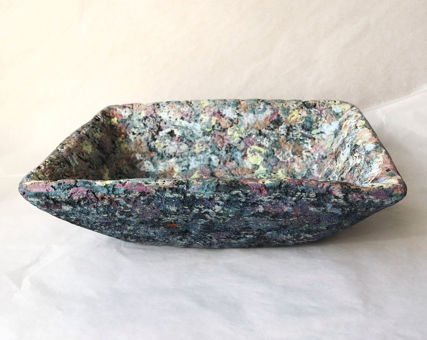 One-of-a-kind handmade paper mache square bowl with sculptural form and terrazzo-like texture. Organic modern decorative catchall for home styling.