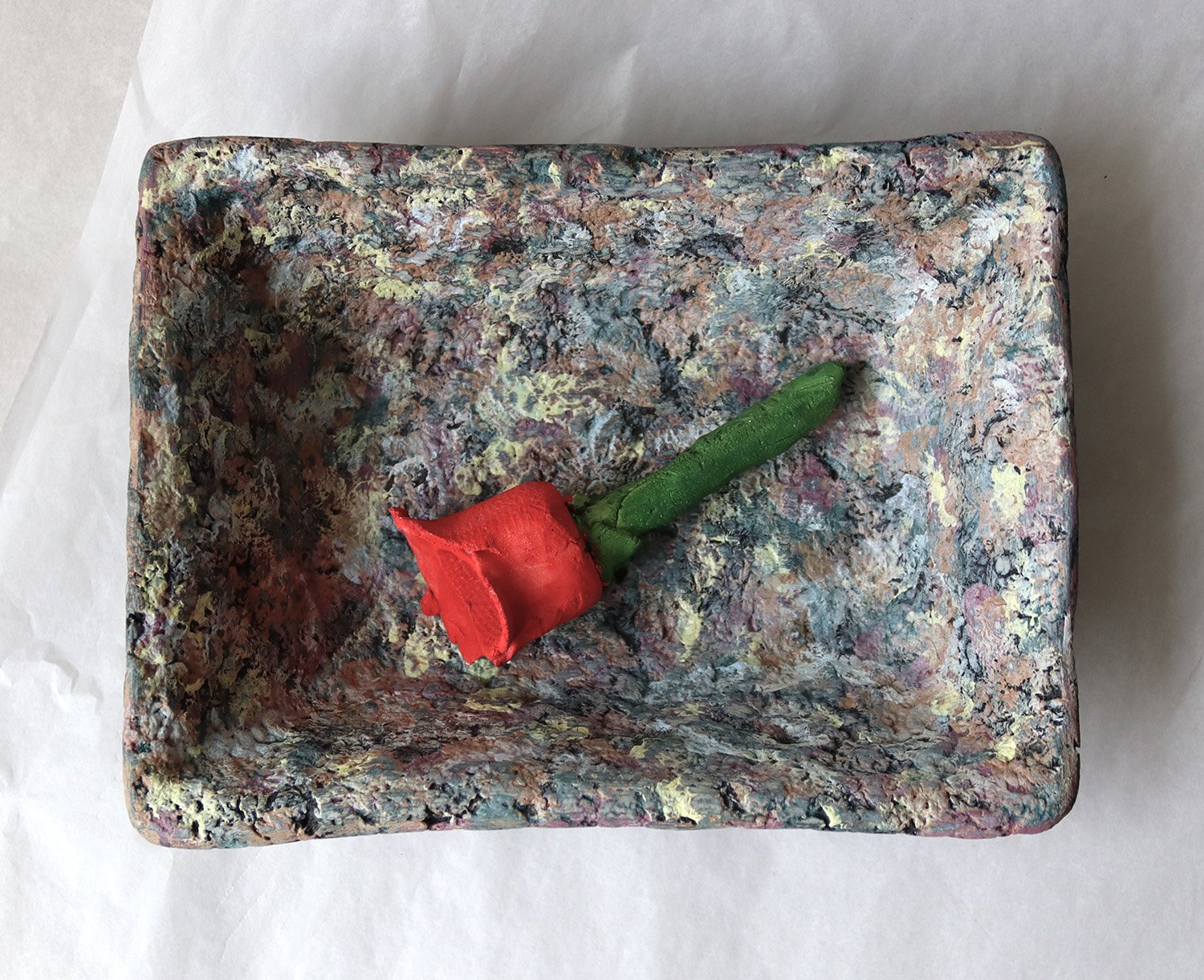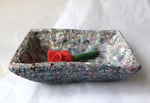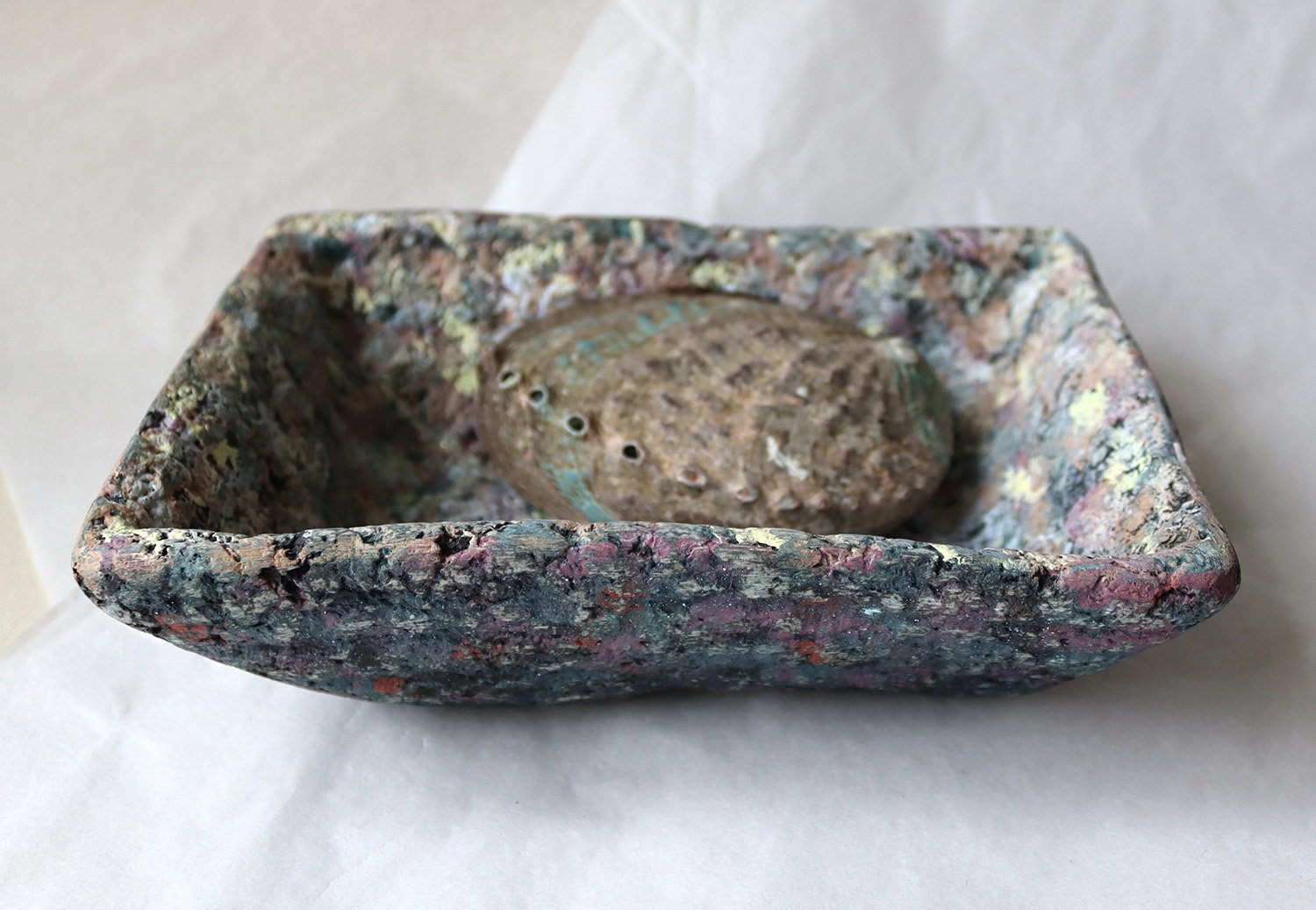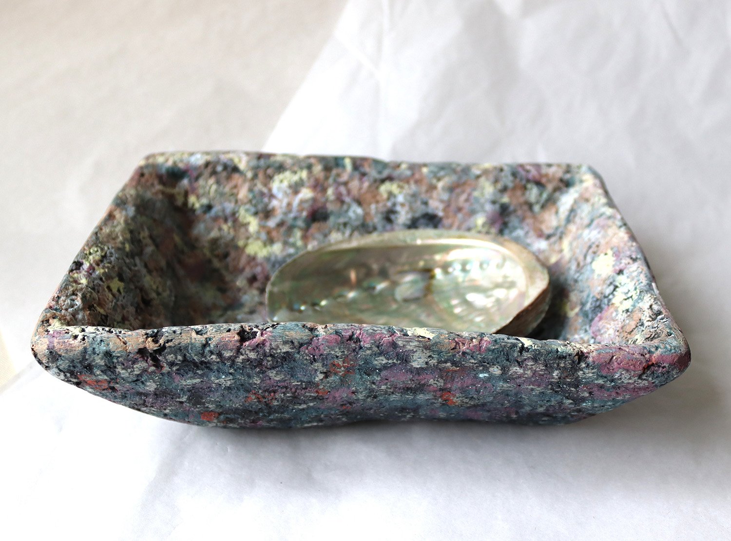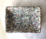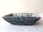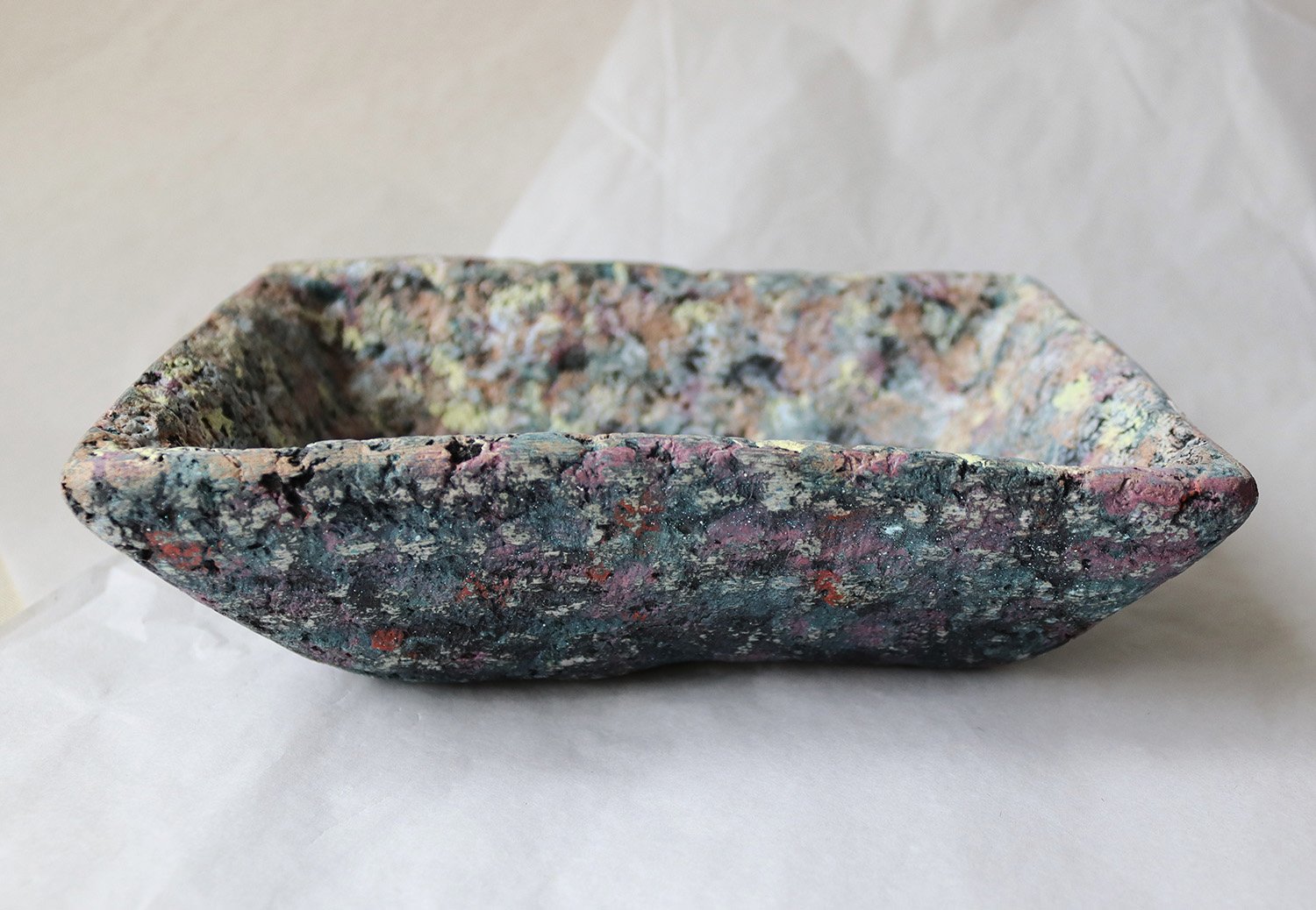 One-of-a-kind handmade paper mache square bowl with sculptural form and terrazzo-like texture. Organic modern decorative catchall for home styling.