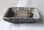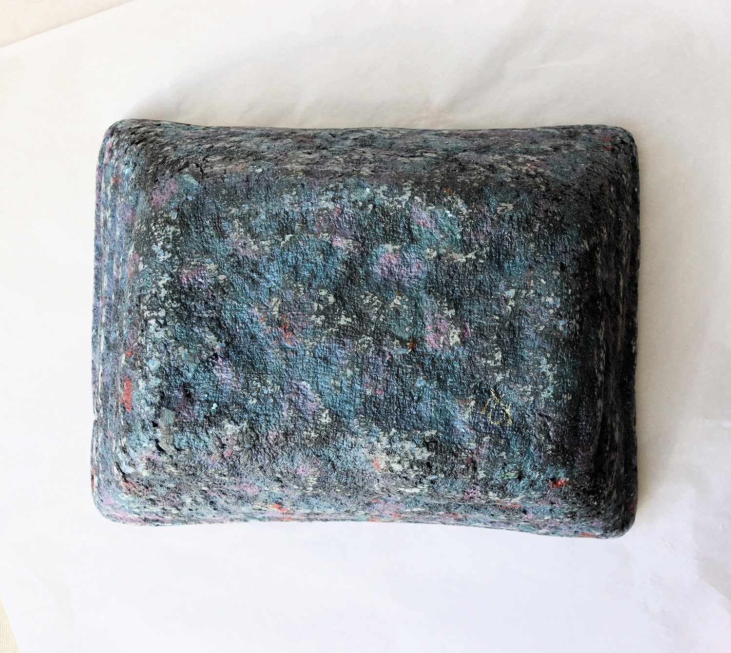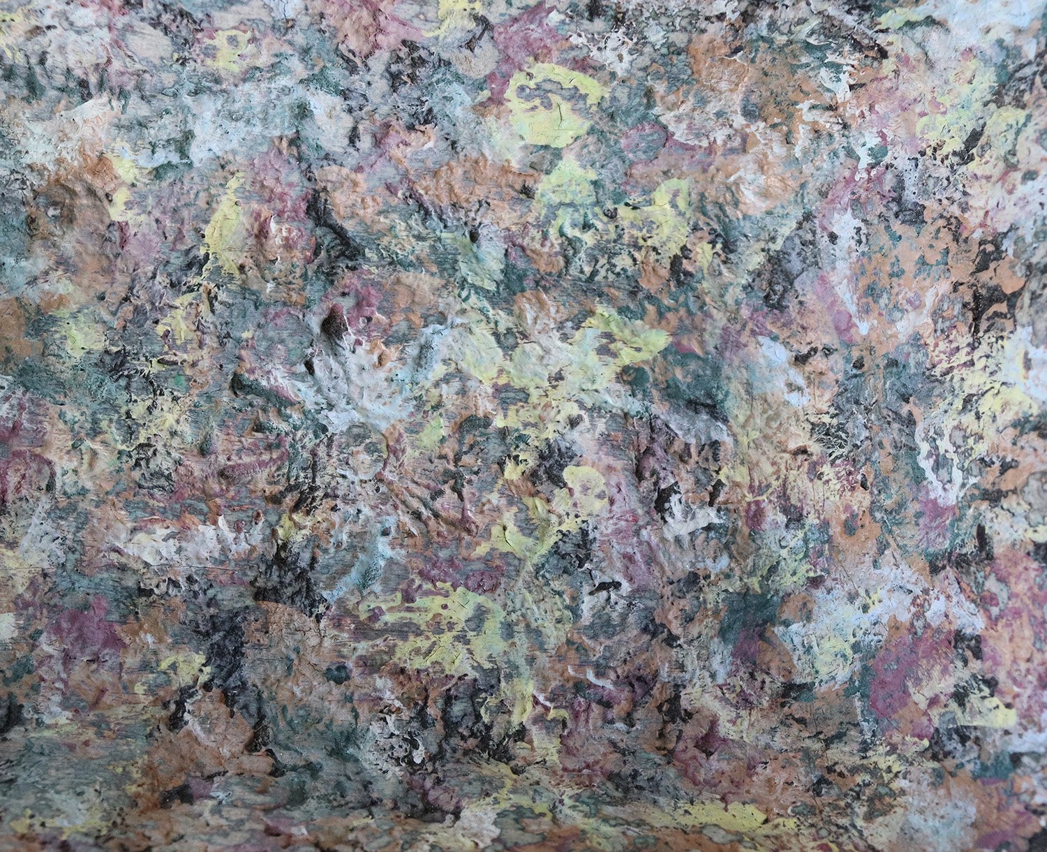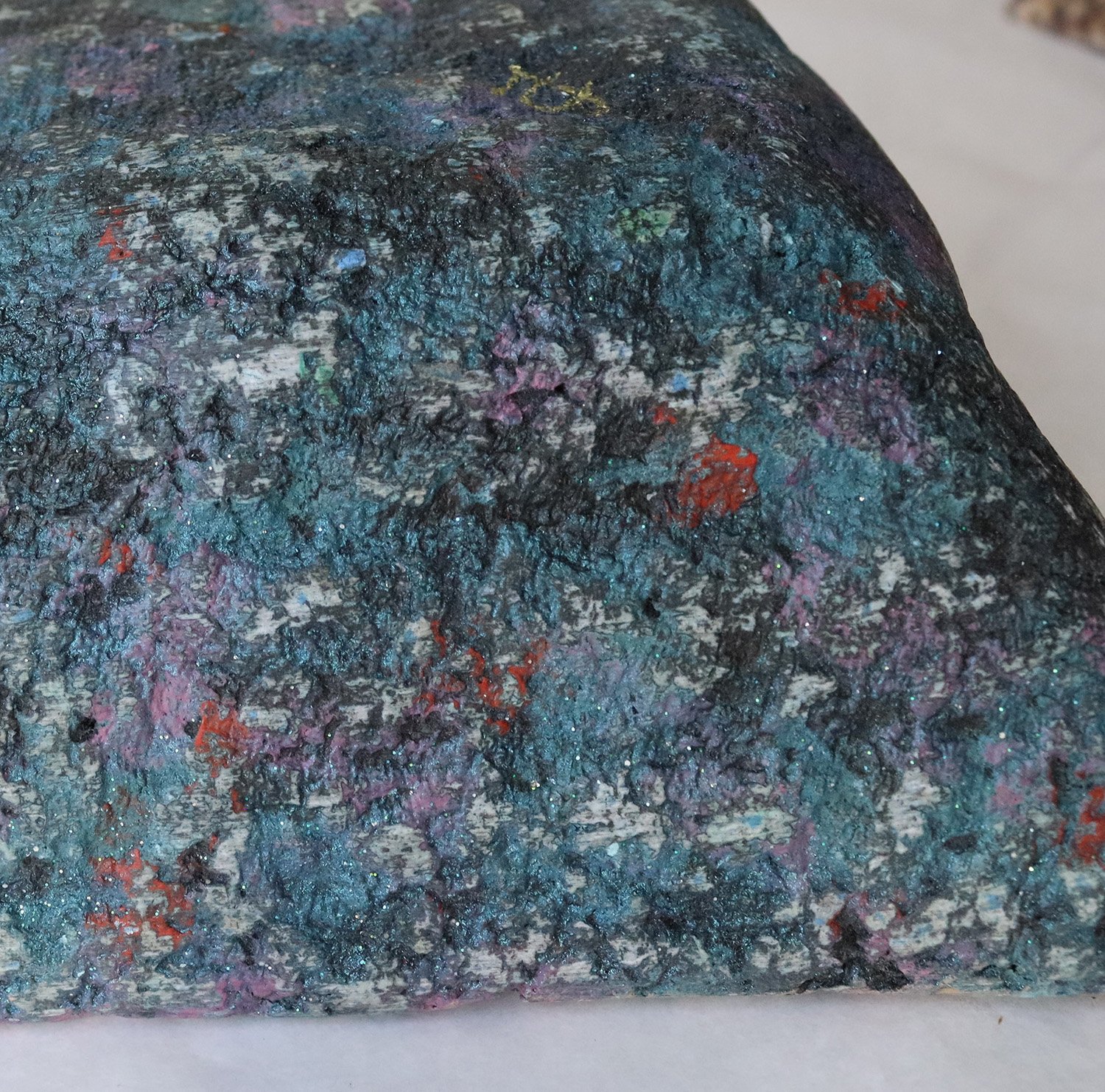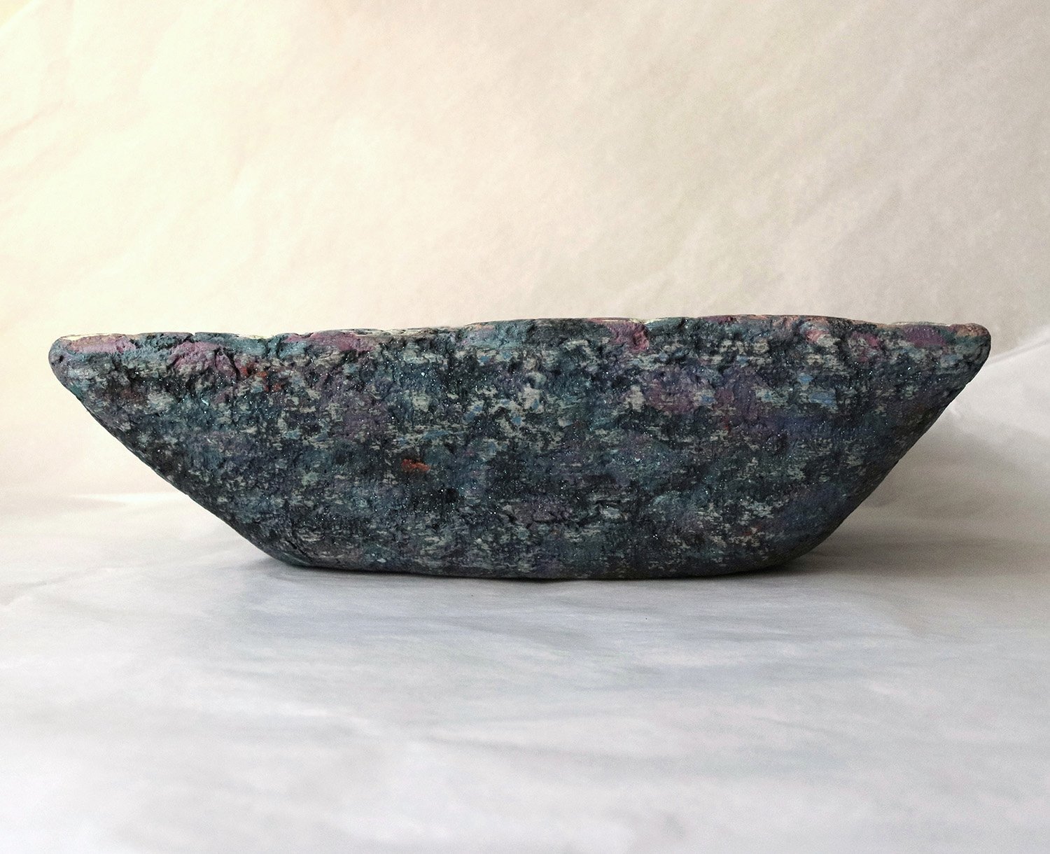 The surface reveals layered tones and mineral-like depth, reminiscent of stone, terrazzo, or weathered surfaces. Light moves across it differently from every angle, emphasizing its handmade character.