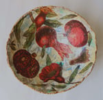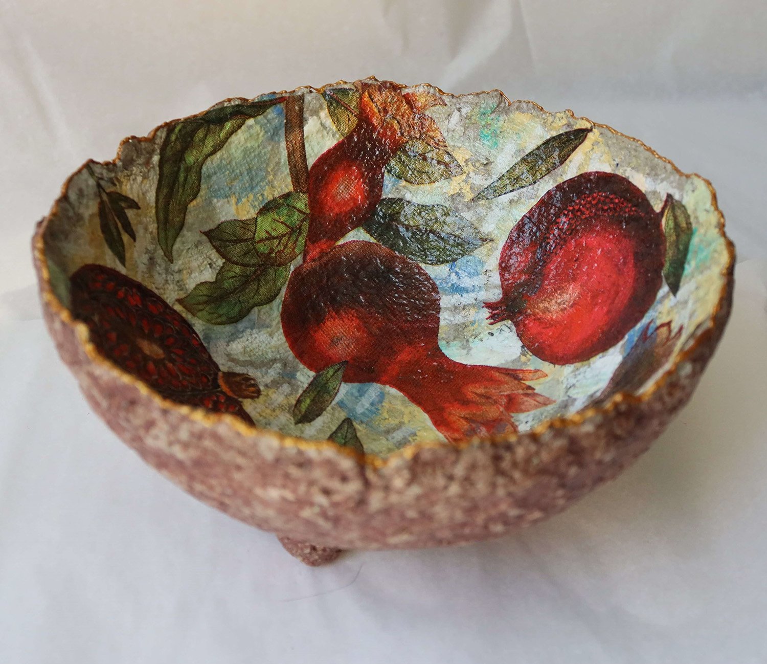 Handcrafted paper mache bowl with vibrant pomegranate decoupage. Unique eco-friendly home decor for a rustic, Mediterranean-inspired home.